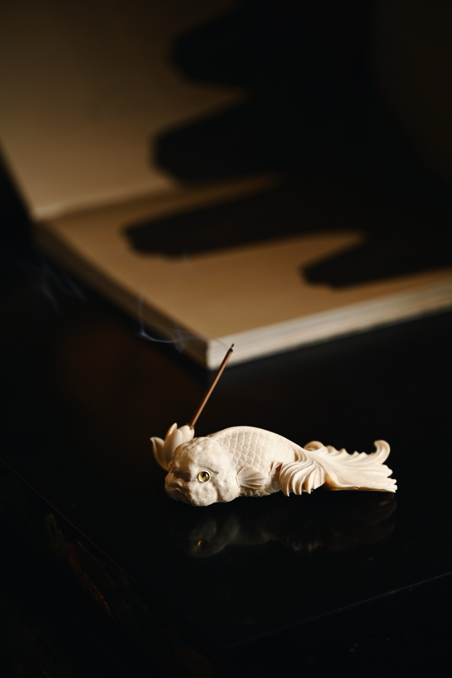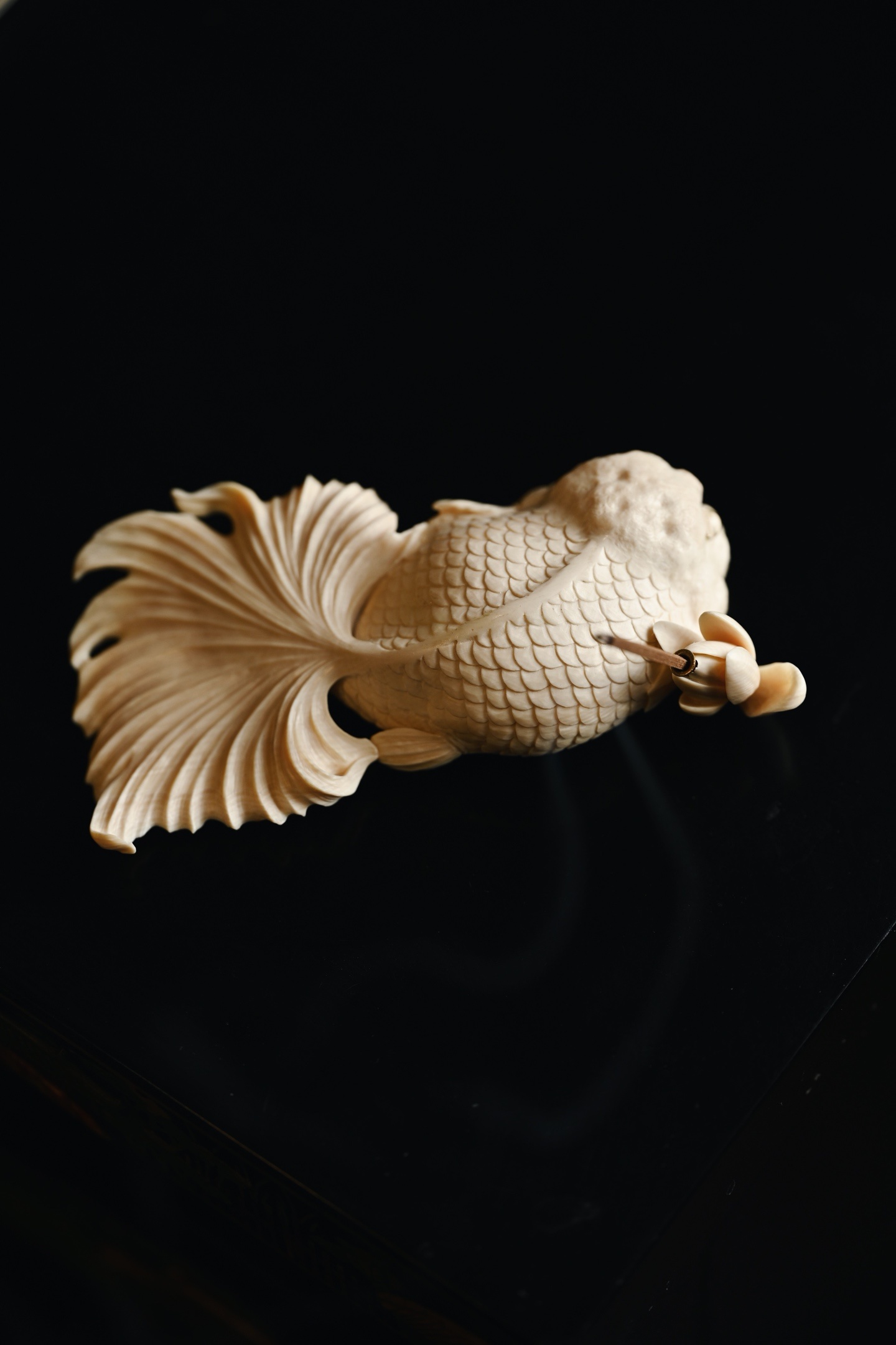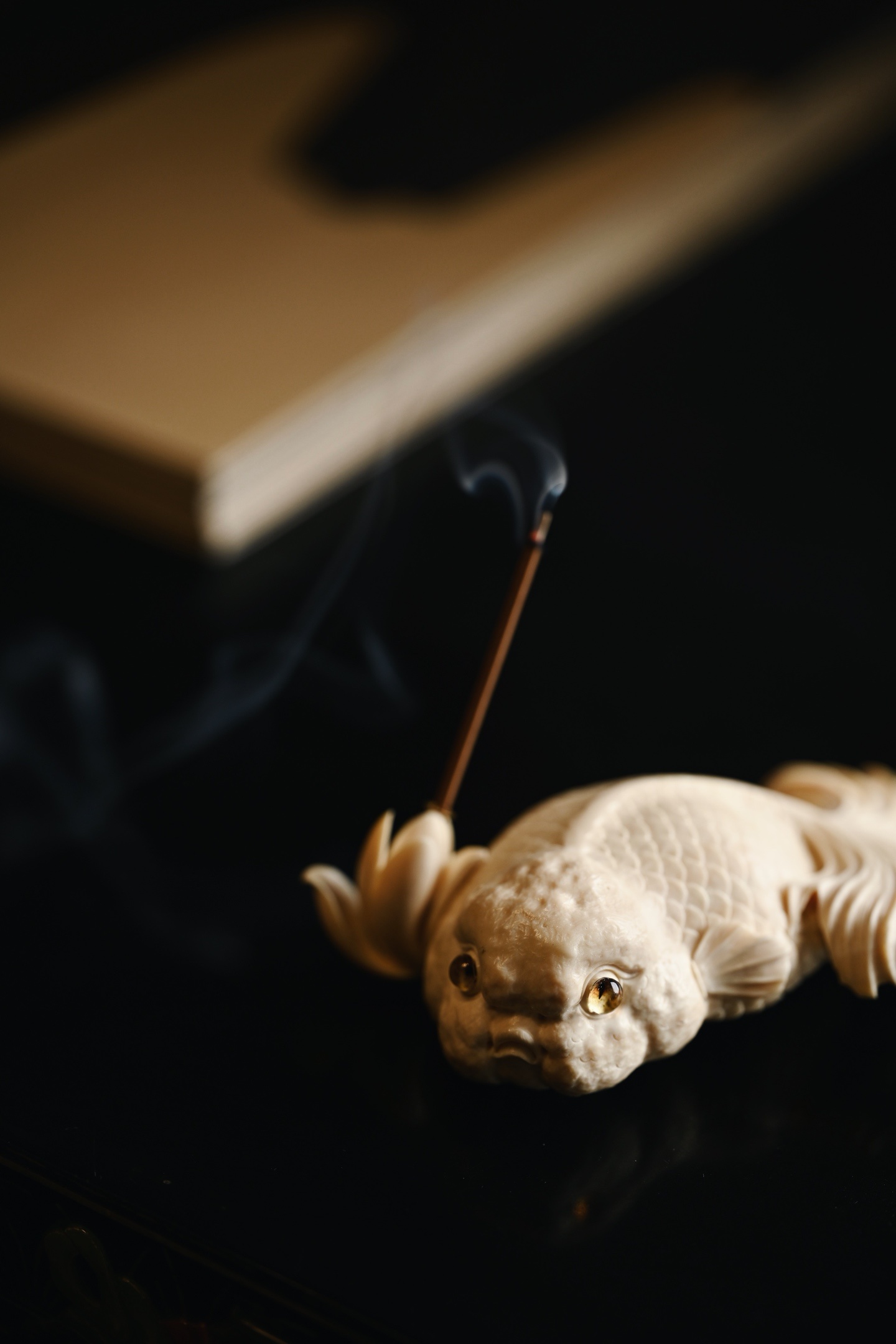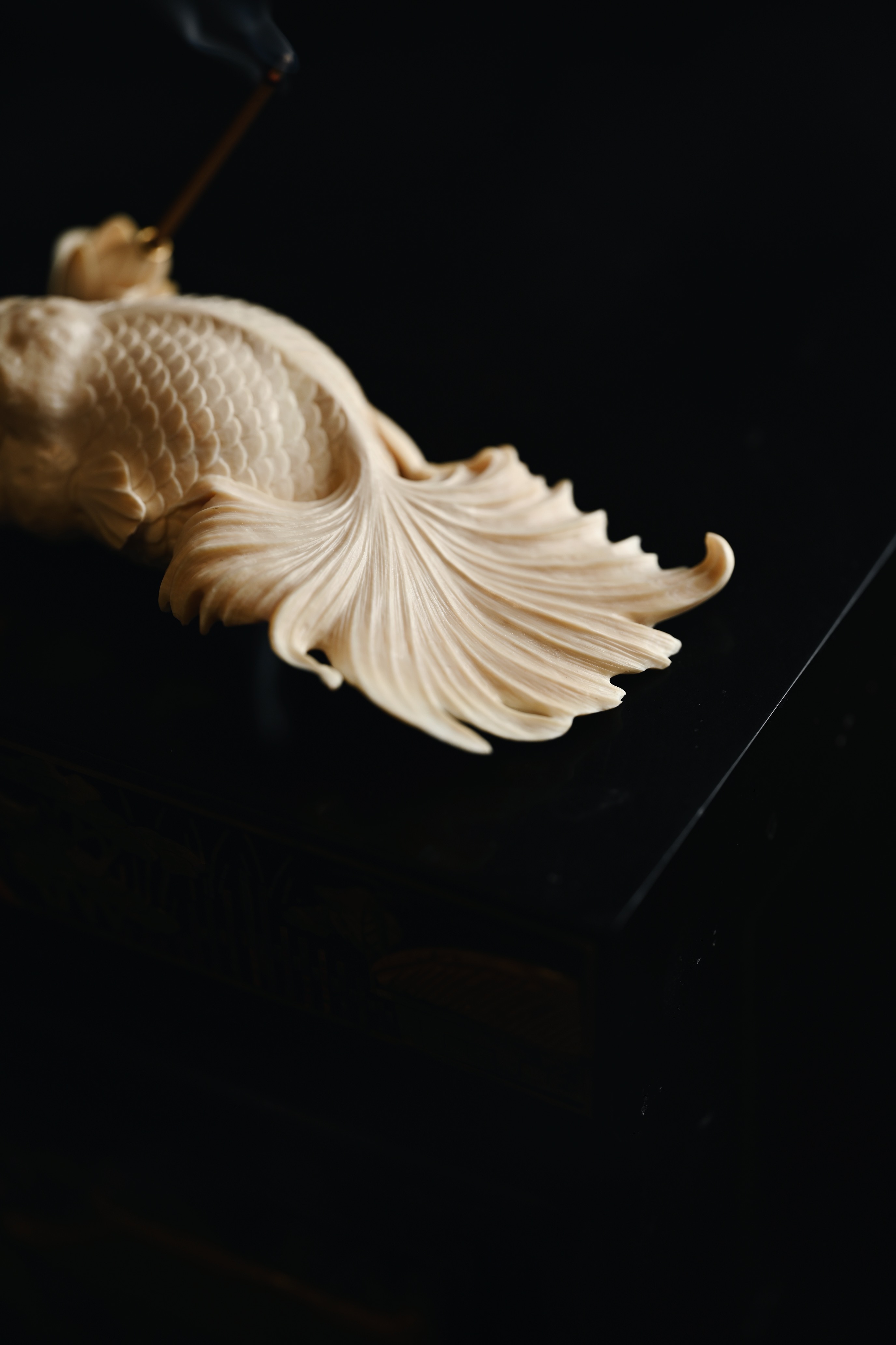 猛犸 | 金玉满堂 香插 摆件温润如脂的猛犸象牙,承载着远古的宁静与时光的馈赠。这件“金玉满堂”香插摆件,选料考究,雕工细腻,金鱼悠游的姿态栩栩如生,鳞片层叠如缕,尾鳍轻盈舒展,仿佛在水中漾开一缕生机。身畔一朵莲花静静盛放,花瓣柔美舒展,中间巧设香插,可立一线清香。青烟袅袅升起时,仿佛莲动鱼游,满室清雅。作品取意“金玉满堂,连年有余”,不仅是一件雅器,更是一份寄托吉祥、静心颐情的案头清赏。