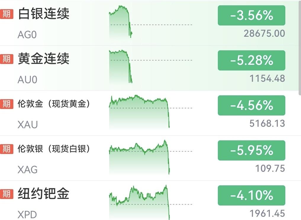 凉凉了!外盘贵金属与有色金属现货期货原本涨得好好的,突然间崩了; 直线跳水,到底发生了什么? 难道是因为老美官员透露,又派了一艘驱逐舰去中东地区; 地区冲突可能性大幅增加,而造成的资金避险情绪么?也不应该呀!不是说开打利好黄金白银、有色金属么? 现在外盘期货现货这样的跳水幅度已经影响到了股票市场,美股三大指数都给带崩了,纳斯达克指数跌幅超2.5%、恒生科技指数期货也跌超2%。 这贵金属期货现货上一秒还在大幅上涨,下一秒就大幅下跌了;冰火两重天也不过如此啊! 这样的趋势明天A股开盘贵金属与有色金属不得凶多吉少了么!看来今天早上被主力资金洗出去那一波人是幸运的,像我这种头铁留下的估计明天一碗大面得吃撑了。 现在只能希望外盘如同今天白天内盘的走势一样,这一波大跳水只是假摔之后走一波深V翻红,希望赶紧拉升吧!