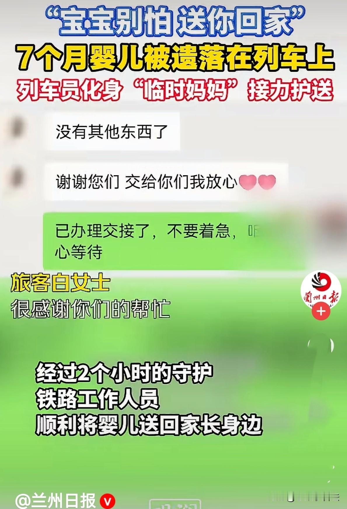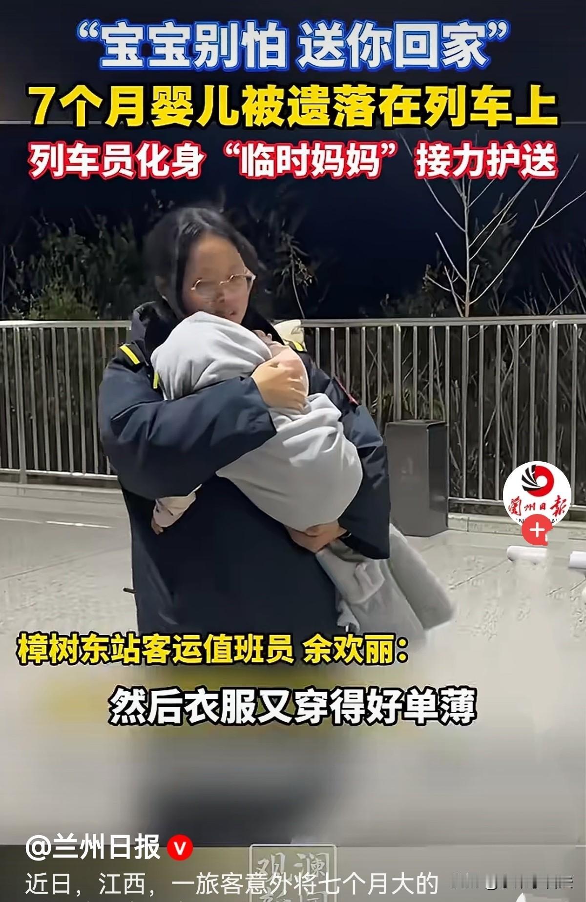 “这妈心不是一般大!”江西一旅客下车,竟将7个月大的婴儿遗落在列车上,列车值班员发现她时,觉得宝宝好小,又穿着单薄,妈妈又把她落在车上,看她哭闹非常心疼。铁路工作人员紧急化身临时妈妈,取来衣物为其保暖,接力护送婴儿返程。经2个多小时守护,顺利将宝宝送回妈妈身边!网友:把自己丢了都不能把宝宝丢了!这妈真是个人才啊! 最近江西一趟列车上发生的事,在网上炸翻了锅。一名从惠州站乘车的旅客白女士,下车时竟粗心到将仅7个月大的女婴,独自遗落在疾驰的列车上。 一场惊心动魄的爱心接力就此展开,铁路工作人员化身临时妈妈,用两个多小时的悉心守护,让宝宝平安回到妈妈身边,而这件事引发的舆论热议,也让不少人陷入深思。 事发当天,G字头列车平稳行驶在江西境内的线路上,客运值班员余欢丽像往常一样巡查车厢。 走到一节空座位旁时,一阵断断续续、细弱的婴儿哭声,猛地揪住了她的心。 她快步上前,只见一个襁褓中的小婴儿,孤零零地躺在座椅上,小脸憋得通红,小嘴巴瘪着不停哭闹。 余欢丽蹲下身仔细打量,心里瞬间又酸又急:这孩子也太小了,软乎乎的像个小团子,身上只套了件薄薄的单衣,列车空调吹过,小胳膊都透着凉意。 再看看四周,压根没有家长的身影,她瞬间反应过来,这是被家长落下的孩子。 “乖,宝宝不哭,阿姨在呢。”余欢丽小心翼翼地将宝宝抱进怀里,轻柔地拍着她的后背。 看着怀里脆弱的小生命,她满是心疼,一边哄着哭闹的宝宝,一边在心里暗骂家长太粗心。 铁路工作人员,火速找来干净柔软的保暖衣物,将宝宝裹得严严实实,生怕小家伙冻出毛病。 与此同时,整个铁路班组迅速行动,调取车厢监控、核对乘客信息、联系车站调度,争分夺秒寻找孩子的家长。 列车上,爱心守护从未停歇。余欢丽和列车员沈女士等人,轮流当起了临时妈妈。有人抱着宝宝轻声哼唱摇篮曲,来回踱步安抚情绪。 有人细心擦拭宝宝嘴角的口水,定时检查她的体温和状态。所有人的目标高度一致:必须以最快的速度,把宝宝平平安安送回家人身边。 经过周密的调度安排,列车与车站敲定了接力交接方案,历经两个多小时的紧张守护,宝宝终于顺利抵达交接站点。 当旅客白女士看到被工作人员抱在怀里、穿戴暖和、情绪安稳的女儿时,她冲上前一把将孩子紧紧搂在怀中,失声痛哭。 她拉着于环丽的手,反复说着感谢:我从惠州站返程,下车太匆忙,脑子一乱就把孩子落下了,真的太谢谢你们了,要是没有你们,我真的不知道该怎么办。 另一边,白女士下车后许久,才猛然反应过来孩子还在列车上。那一刻,她浑身的血液仿佛都凝固了,大脑一片空白,双腿发软几乎站不住。 这件事曝光后,立刻引发网友的激烈讨论。 不少网友直言不讳:行李忘了能理解,把几个月的宝宝丢在车上,心也太大了,根本不配当父母! 有人说,把自己丢了都不能把宝宝丢了,这妈真是太不合理了!让人无语! 更有理性网友提出质疑:丢失行李是粗心,可遗弃毫无自理能力的婴儿,完全违背常理,这究竟是单纯的疏忽,还是涉嫌故意遗弃,值得深究。 对此您怎么看?