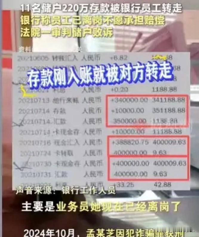 内蒙古,女子在银行存了75万,没想到柜员将这笔钱钱私下转走了,女子发现时,柜员已经将钱挥霍一空,且锒铛入狱,根本无力偿还。同时,女子得知被骗的还有其他11个储户,共计220万。女子认为,柜员是银行的职员,银行有监管责任,应为此承担责任,于是,向银行讨要说法。可银行认为这是柜员的个人行为,和银行无关!女子一气之下,将银行告上法庭。法院的判决让女子痛哭流涕。 朱女士省吃俭用攒下了75万元钱,有了这笔钱,朱女士走路都带风,心里有了底气,后半辈子养老,看病都有了指望。 这笔钱可是她的命根子啊!放在家里的时候,自然不安心,还是银行安全又可靠。 于是,她选择了一家信得过的银行,准备将这笔钱存进去。 当日接待她的银行柜员是孟某,朱女士没多想,就把钱递过去,身份证、银行卡也一并交上,孟某怎么说,她就怎么签字、按手印,全程都照着工作人员的指引来。 办完事拿着回执单,朱女士还特意看了一眼,确认单子上写着存款,才放心地回了家。 可谁能料到,这安心日子没过多久,朱女士想去取点钱贴补家用,一查余额,当场就懵了—。 账户里干干净净,那75万压根没影了! 她腿都软了,跌跌撞撞跑到银行质问,这才知道,她的钱被当时办理业务的孟某偷偷转走了! 朱女士急得直哭,赶紧找孟某要说法,结果得知的消息让她如遭雷击:孟某不光转了她的钱,还转了另外11个储户的钱,加起来有220多万,全被她挥霍一空了! 现在孟某已经因为诈骗被判了刑,关进牢里了,别说75万,她连一分钱都拿不出来赔偿。 看着空荡荡的账户,朱女士心疼得直掉眼泪,但她心里还有个念想:跑得了和尚跑不了庙啊! 自己把钱存到银行的,孟某是银行的员工,在工作岗位上把我的钱转走了,银行肯定得负连带责任。 这75万就该银行赔给我,至于银行之后要不要找孟某追责,那是他们的事,跟我没关系。 可当她找到银行讨说法时,却被泼了一盆冷水。 银行的人把她拒之门外,冷冰冰地说孟某已经离职了,她的损失跟银行没关系,银行不负责。 朱女士彻底崩溃了,坐在银行门口哭了半天。孟某已经蹲大牢了,没钱还;银行又撒手不管,难道这75万的损失就得让她这个普通老百姓自己扛? 她不服气,明明是信任银行才去存钱,现在钱没了,哪儿有说理的地方? 一怒之下,朱女士找了律师,把银行告上了法庭,要求银行赔偿她的75万本金和相应的利息。 她满心以为,自己占着理,官司肯定能赢,毕竟钱是在银行被员工转走的,银行怎么也脱不了干系。 可做梦也没想到,法院一审判决下来,她竟然败诉了!这个结果让朱女士一下子懵了,半天没缓过神来。 75万啊,那是她半辈子的血汗,是她后半辈子的依靠,就这么没了? 她咽不下这口气!明明是去银行存钱,钱被人转走是银行监管不到位,凭啥让她承担损失? 朱女士咬着牙,心里只有一个念头:不能就这么算了!她决定继续上诉,哪怕耗上再多时间和精力,也要把自己的血汗钱追回来。这理,总得有人给她评! 《商业银行法》第6条规定:商业银行应当保障存款人的合法权益不受任何单位和个人的侵犯。” 朱女士与银行建立了储蓄合同关系,银行不仅有义务保管好储户的存款,更有责任建立完善的内部监管机制,防范员工利用职务之便侵害储户权益。 孟某作为银行柜员,在工作场所、工作时间内为朱女士办理“存款”业务,其行为属于职务行为,银行未能及时发现并制止孟某的违规操作,存在监管疏漏,理应承担相应的赔偿责任。 一审判决朱女士败诉,可能涉及证据认定、责任划分等具体法律细节,但这并不意味着朱女士的诉求没有法律依据。 相信在上诉过程中,法院会更全面地审查银行的监管责任、储蓄合同的履行情况等关键问题,给朱女士一个公正的判决。 毕竟,普通老百姓把一辈子的血汗钱存进银行,图的就是一个安全放心,银行不能因为员工离职就推卸责任,更不能让储户为银行的监管失职买单。 希望二审能还朱女士一个公道,也希望银行能以此为戒,加强内部管理,守护好储户的“钱袋子”。
