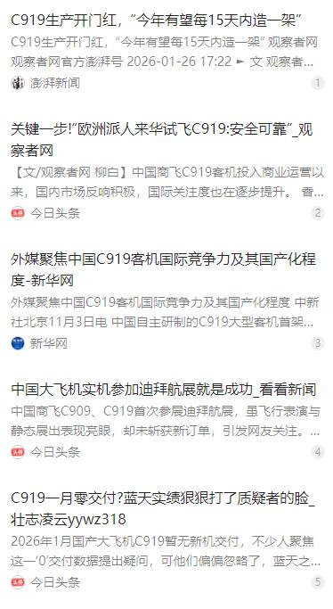 国产大飞机C919,1月份到现在,一架没交。但就在昨天,全国的天空上,它的身影就没断过。天南地北的机场,起落架一次次收起、放下。一天之内,108个商业航段。算上调机,总共110次起降,直接刷了个新高。   麻烦看官老爷们右上角点击一下“关注”,方便您进行讨论和分享,感谢您的支持!   2026 年 1 月的国产大飞机 C919,在交付端迎来了暂时的空窗期,截至目前没有一架新机交付,这一数据也让不少人对其发展产生了些许关注。但这份关注在真实的飞行实绩面前,很快有了最直观的答案。   就在近日,C919 迎来了运营以来的飞行高峰,全国各大机场的天空中,随处可见它的身影。这一天里,它完成了 108 个商业航段,算上调机的飞行任务,总共实现 110 次起降,直接刷新了单日起降的最高纪录。   起落架一次次在天南地北的机场收起、放下,发动机的轰鸣声成为了最有力的证明,即便没有新机交付,现有的 C919 机队已经形成了稳定且强劲的飞行能力,成为国内民航运输中实打实的空中力量。   这份运营成绩的背后,是 C919 一步步稳扎稳打的发展,而它的成长之路,也并非一帆风顺,2025 年 5 月的一次供应链波动,就让其生产受到了直接影响。当时美国突然暂停了 C919 所用 LEAP-1C 发动机的出口许可,直接导致商飞生产线停摆两周。   这次断供也让 C9192025 年的交付计划受到重创,原本定下的 75 架交付目标,最终只完成了 15 架,虽较前一年实现了数量增长,但与预期仍有不小差距。好在供应链的问题后续逐步缓解,去年最后两个月,C919 还创下了每月交付 4 架的量产纪录。   困境之下,C919 的交付和运营却始终在稳步推进,截至 2026 年 1 月,C919 累计交付数量达到 32 架,累计运送旅客的数量也在 2025 年底成功突破 400 万人次,从 2023 年 5 月投入商业运营开始,两年多的平稳飞行交出了亮眼的答卷。   随着 2026 年春运大幕拉开,C919 也迎来了春运的实战考验,东航旗下的 14 架 C919 全部敲定了春运运营计划,日均执飞近 50 个航班,航班量较去年春运同期增加了一半还多,成为春运客运高峰里的主力运力。   如今的 C919,早已不是只执飞京沪热门航线的 “点缀款”,它的航线网络正像毛细血管一样铺满全国,下个月还将新开上海飞珠海、西安飞上海浦东、成都飞厦门三条航线,航线版图还在持续扩张。   不仅如此,C919 也彻底打破了以上海为运营大本营的格局,南航率先实现了广州 - 长沙双基地运行,长沙也成为继北京、上海、广州后,第四个能独立执管 C919 的城市,整套运营、维修体系开始向下扎根。   从最初乘客抱着支持国产的心态尝鲜体验,到如今因为客舱新、座椅宽、噪音小的优势,成为越来越多旅客的出行优选,C919 用实际的飞行体验,赢得了市场的认可,这份认可也成为其持续发展的底气。   当然,走向更广阔的市场,C919 目前还面临着一些现实的困境,其中欧盟适航证的敲定,就是其打开国际市场的关键一步。不过目前适航认证工作正在稳步推进,2026 年 1 月,欧洲航空安全局的人员已在上海对 C919 开展试飞评估。   此次试飞评估其实在 2025 年 11 月就已启动,评估过程中,EASA 方面表示,C919 整体性能良好且安全可靠,仅存在一些需要微调的初期问题,不存在硬件方面的缺陷,这也为后续适航证的落地奠定了基础。   2025 年 11 月的迪拜航展,是 C919 首次亮相中东市场,两架 C919 完成了飞行表演和静态展示,还迎来了诸多中东航空公司高层的实地考察,但最终却未能斩获任何海外订单,这也是其国际发展的一次现实考验。   迪拜航展的零订单,核心原因还是 C919 尚未取得欧美适航证,欧美针对其设置了远超同类机型的特殊审查标准,形成了市场壁垒,这也让其在主流国际市场的销售和运营受到了限制,本质上也是一种贸易保护。   而在早前的极端环境测试中,C919 也曾遇到过小问题,在挪威的暴风雪测试中,曾出现起落架液压渗漏的情况,不过这类问题也在后续的测试和改进中逐步解决,成为机型优化升级的重要参考。   面对发展中的种种挑战,C919 的破局之道,始终离不开自主研发的核心,而国产发动机的研发进程,更是决定其未来发展的关键。目前为 C919 配套的国产 CJ-1000A 发动机,已经进入了适航取证的冲刺期。   这款中国首款拥有完全自主知识产权的大涵道比涡扇发动机,已完成高原、高温、结冰等多项环境适应性测试,预计 2026 年上半年拿到国内型号合格证,三季度实现首架装机交付,2027 年开始小批量交付。