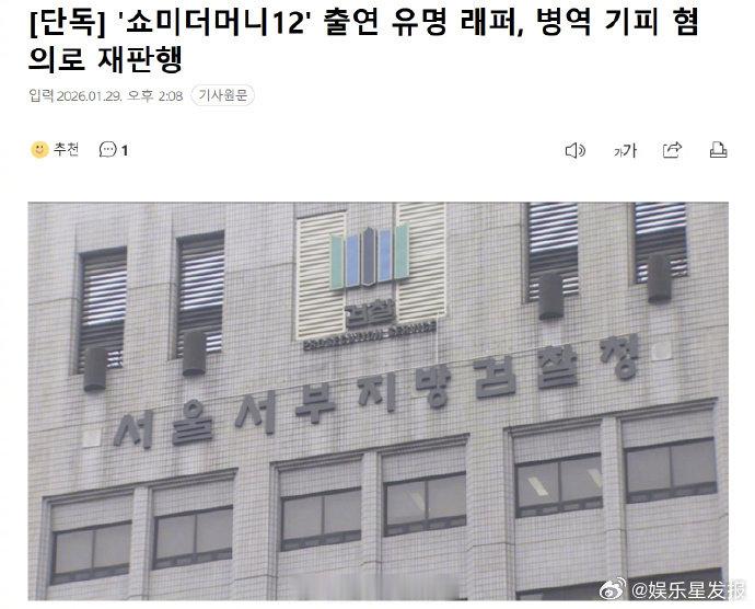 韩国Rapper涉逃兵役被送审SMTMRapper涉逃兵役被送审 韩媒 MBN 29 日消息,出演《Show Me The Money12》的某知名 Rapper,因涉嫌伪装抑郁症逃避兵役,于 28 日被首尔西部地方检察厅以违反兵役法起诉送审。据悉他 2016 年初检为 2 级兵役适格,2022 年 1-6 月刻意接受精神科治疗,将等级改为 4 级并以社会服务要员服役,后被兵务厅特别司法警察查出猫腻。