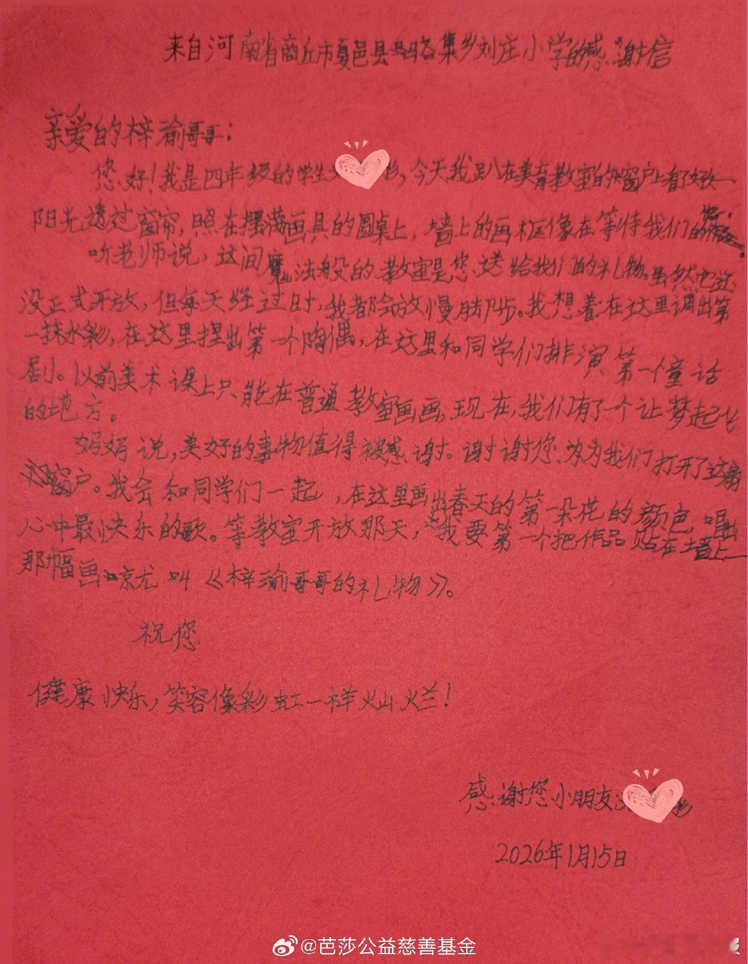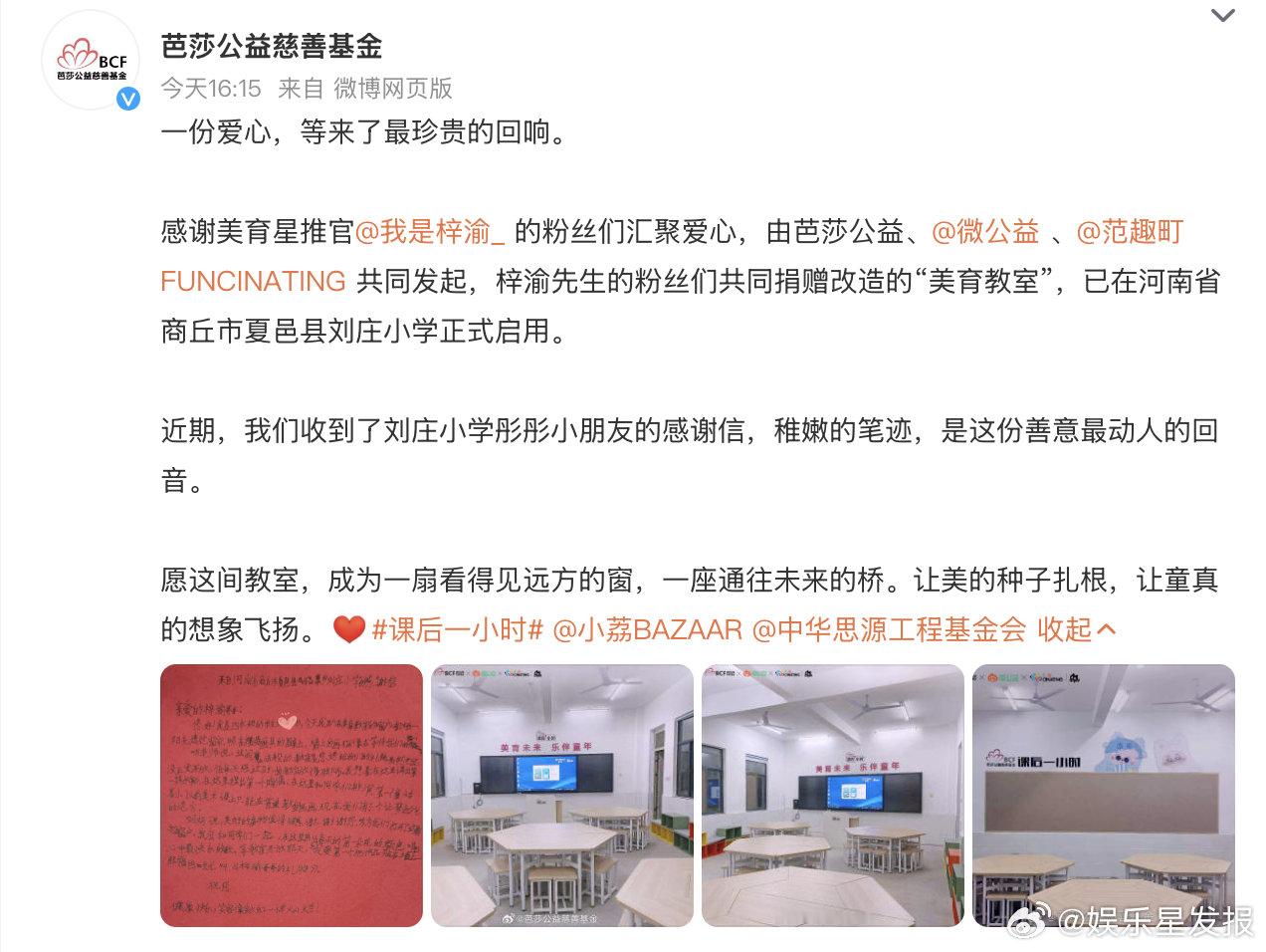 梓渝粉丝捐建美育教室正式启用梓渝收到小朋友手写感谢信 1月29日,正式发文宣布:由粉丝以偶像之名捐赠改造的美育教室,在河南商丘夏邑县刘庄小学顺利启用~更有甜甜的双向奔赴,梓渝收到了该校彤彤小朋友的手写感谢信,稚嫩的笔迹藏着最纯粹的真诚,粉丝追光而行传递温暖,偶像与粉丝一起做公益的样子也太美好了❤️
