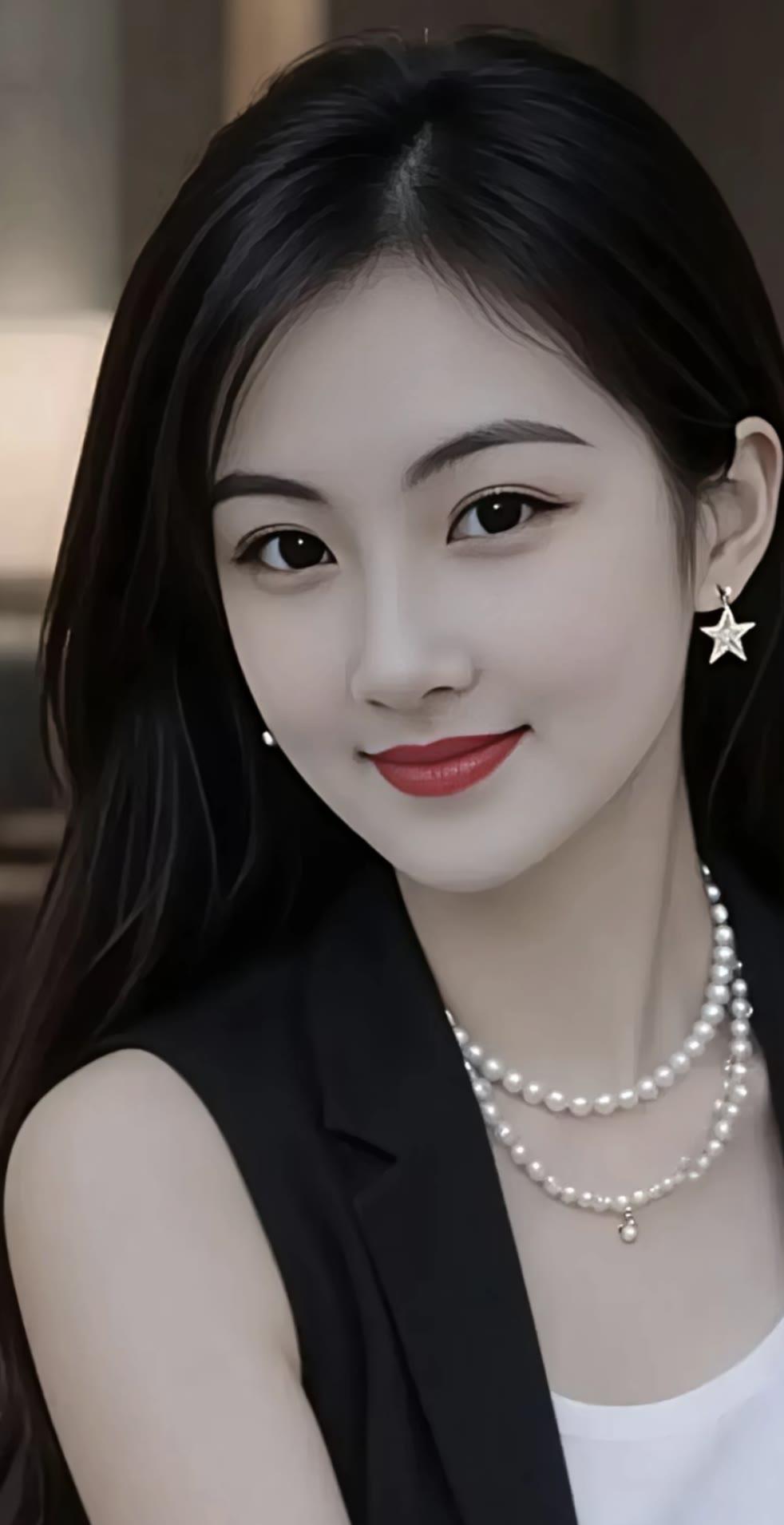 优雅黑发少女,珍珠项链点缀,微笑动人