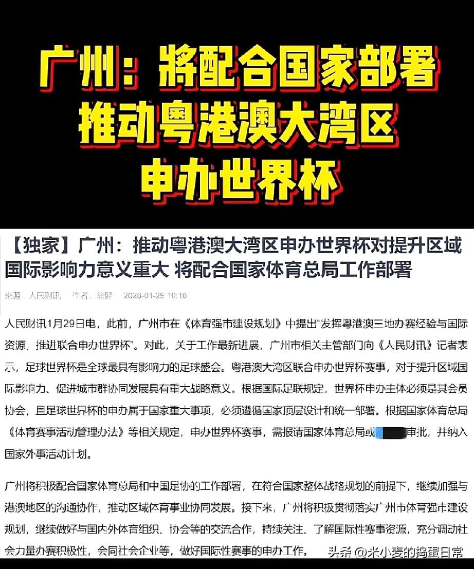 大湾区要冲世界杯了! 广州官宣牵头申办,这波能成吗? 家人们刚刷到一个猛料!广州今天官宣,要联合粤港澳大湾区申办世界杯了! 这事儿可太炸了!要知道世界杯可是全球流量天花板,能把整个大湾区的国际影响力直接拉满。广州、香港、澳门三地联手,既有天河体育场这种现成的顶级场馆,又有办过亚冠、世乒赛的成熟经验,硬件软件都在线。 但也有人泼冷水:“中国足球这水平,办世界杯会不会尴尬?”其实申办和参赛是两码事!当年韩日办世界杯时,韩国队也没现在这么强啊。而且大湾区联手办赛,能直接带动基建、旅游、就业,对普通人来说都是实打实的好处。 更关键的是,这不是广州自己瞎折腾,是跟着国家体育总局的统一部署走的。我觉得这波稳了一半,就看国际足联的态度了。 大家觉得咱们大湾区能拿下世界杯主办权吗?评论区聊聊你的看法!