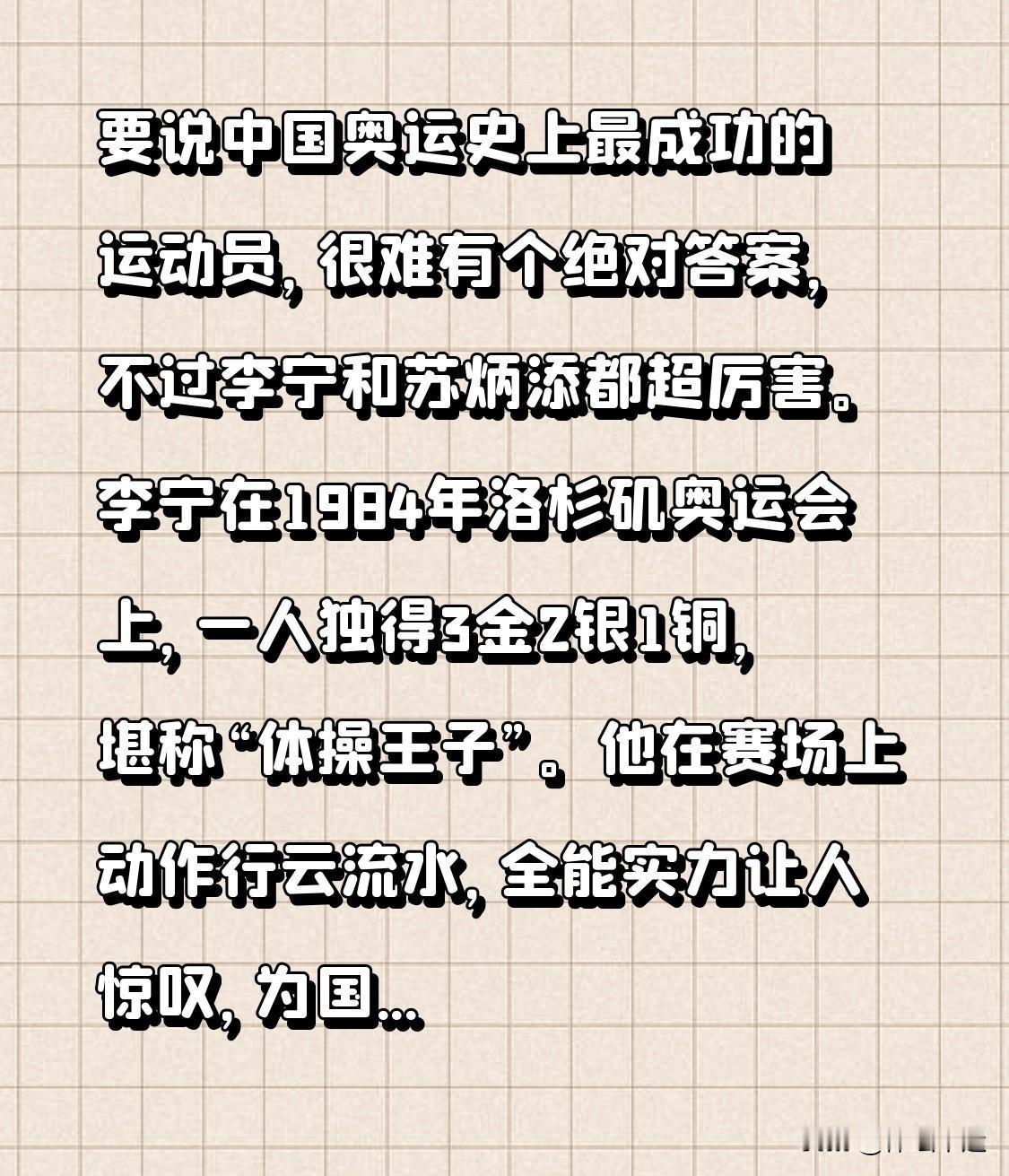 要说中国奥运史上最成功的运动员,很难有个绝对答案,不过李宁和苏炳添都超厉害。 李宁在1984年洛杉矶奥运会上,一人独得3金2银1铜,堪称“体操王子”。他在赛场上动作行云流水,全能实力让人惊叹,为国争了大光,影响力至今不减。 苏炳添虽没奥运金牌,但他在2021年东京奥运会男子100米半决赛中,跑出9秒83的成绩,打破亚洲纪录,成为首位闯进奥运百米决赛的黄种人。这一成绩让全球看到了中国短跑的实力,激励着无数年轻人投身田径运动。这两位运动员都在中国奥运史上留下浓墨重彩的一笔。