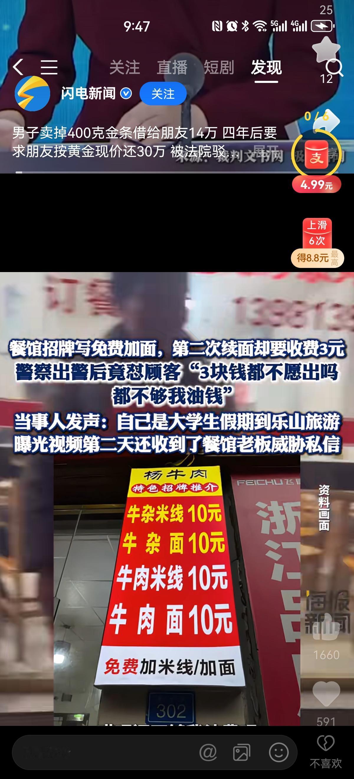 一个大学生去乐山旅游, 看见餐馆招牌写着: “免费加米线/加面”, 第一次续面没问题, 第二次再续,老板直接要收3块钱。 大学生当场懵了:“不是写了免费吗?” 老板直接耍无赖: “免费是第一次,第二次就得给钱!” 大学生直接报警了, 离谱的是,报警之后, 出警的民警居然对着大学生说: “3块钱都不愿出吗?都不够我油钱!” 合着这是来劝和的, 还是来帮老板站台的? 我就想问: ✅ 招牌上写的“免费加面”,没说“仅限一次”,这不就是虚假宣传、玩文字游戏吗? ✅ 消费者较真维护权益,怎么就成了“3块钱都不愿出”? ✅ 民警出警是为了维护公平正义,怎么反而替商家说话,还说出“不够油钱”这种话? 3块钱事小,但这事性质太恶劣了! 游客去外地旅游,本来就是冲着当地的口碑和信任,结果被商家坑了,报警还被民警怼,换谁不心寒? 更气人的是,曝光视频之后,商家还发私信威胁学生! 这已经不是宰客了,这是赤裸裸的店大欺客,背后还有人撑腰? 我们总说“旅游城市要靠口碑”, 可就是这种耍小聪明的商家和拎不清的执法者,一点点把城市的口碑败光了。 今天你坑3块,明天他坑5块, 最后谁还敢来? 3块钱谁出不起?不过是这口气咽不下! 消费维权不是小题大做, 是在维护每个普通人的合法权益。 这件事,你怎么看?