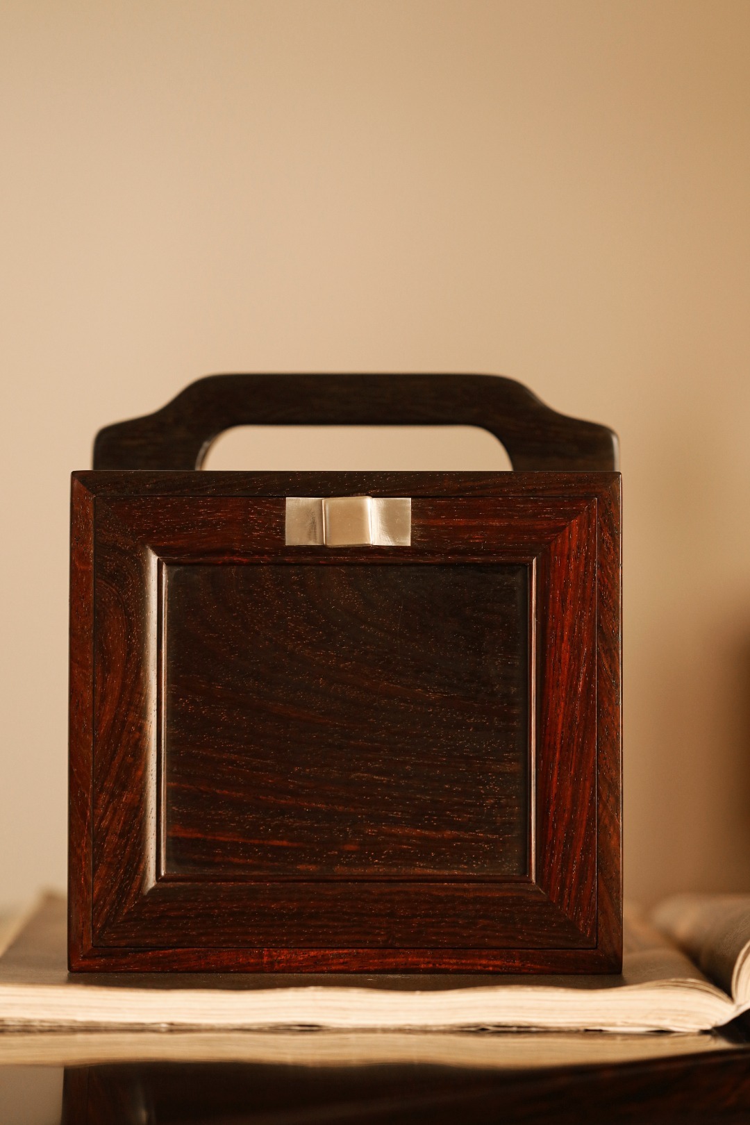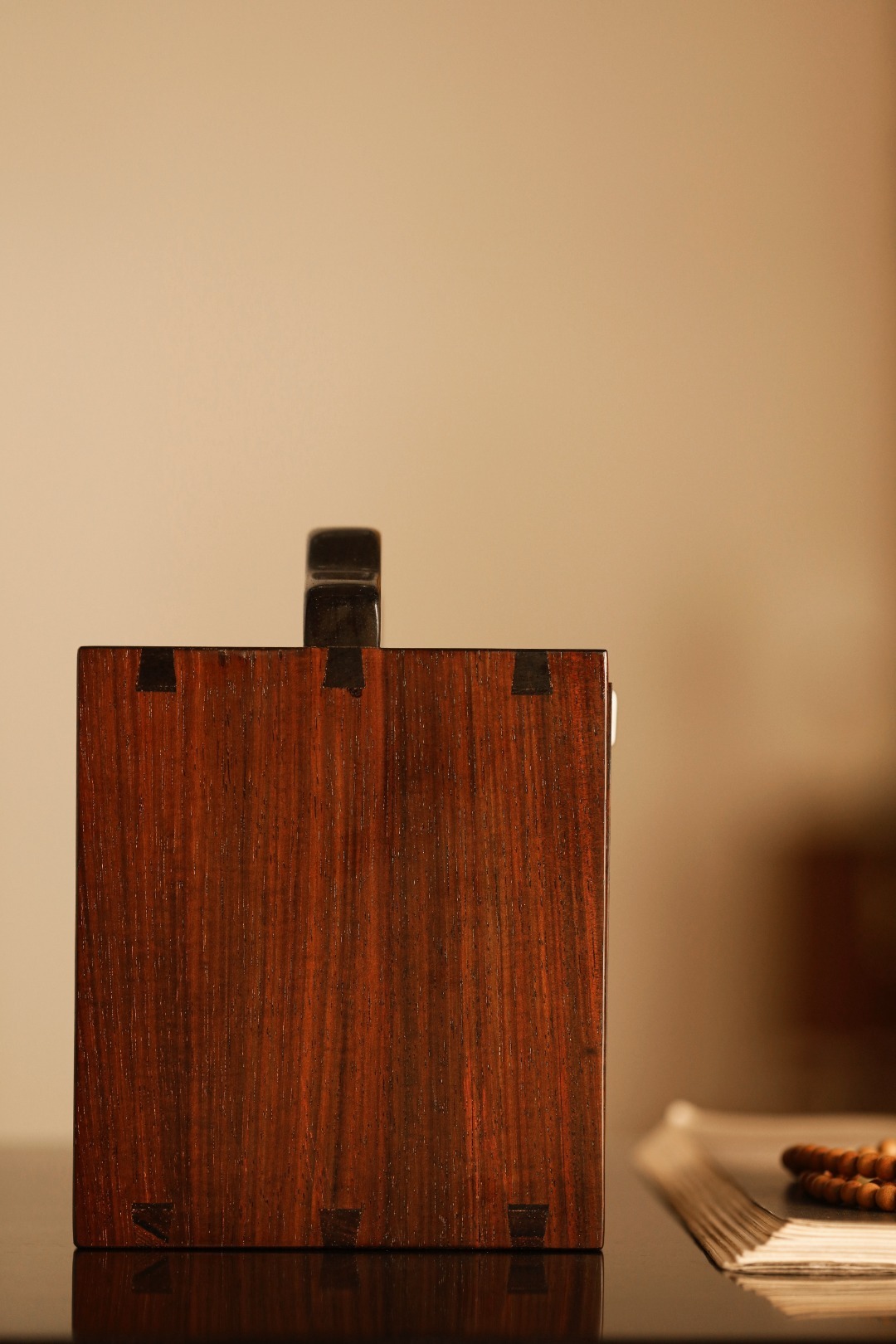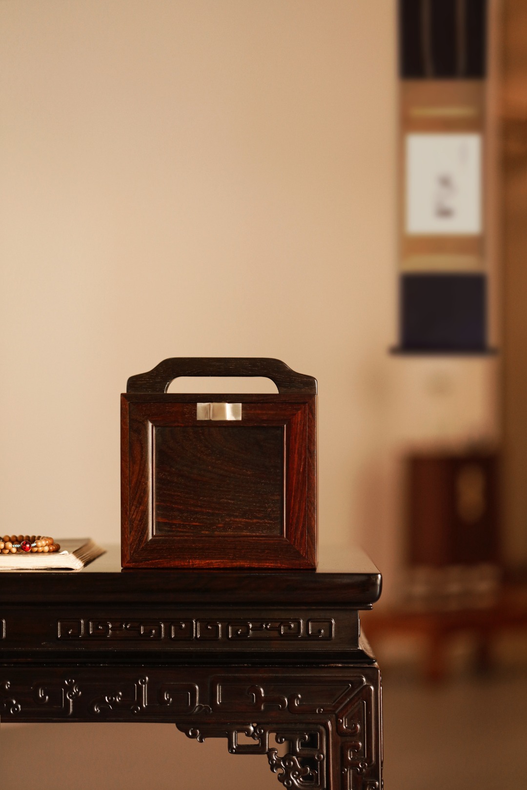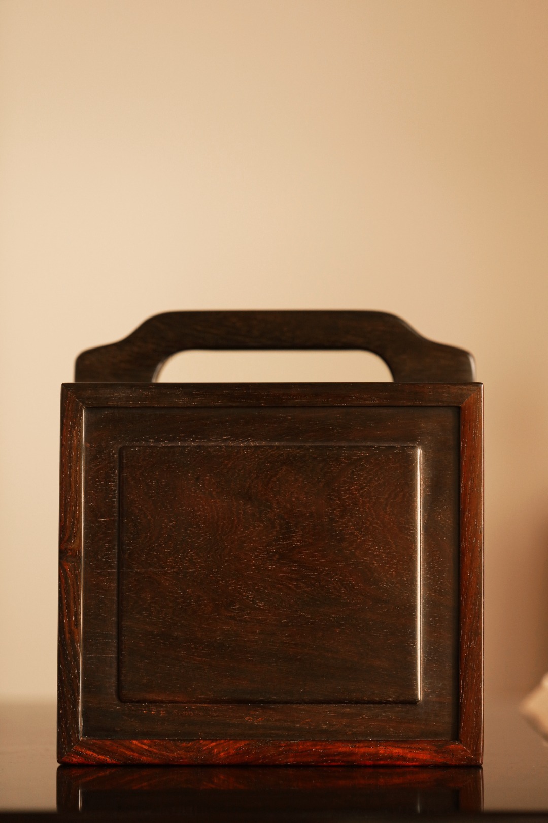 大红酸枝【怡轩】提盒大红酸枝老料制作,榫卯精工,铜饰平镶,工艺谨严考究,提梁趁手,内设多格,收纳雅物珍玩,古韵十分。15.5*12.4*16.6cm 重1415g 大红酸枝【怡轩】提盒