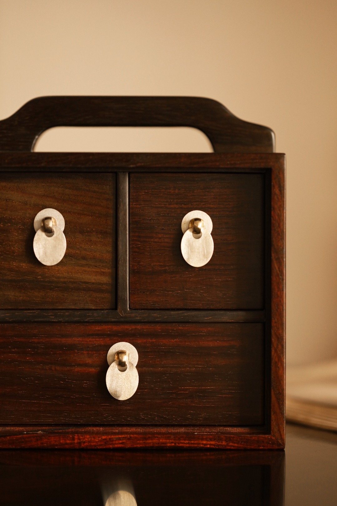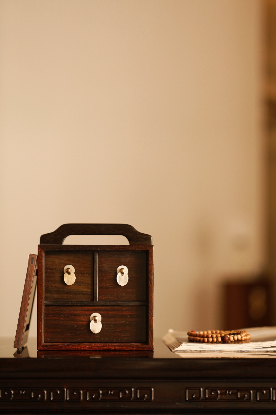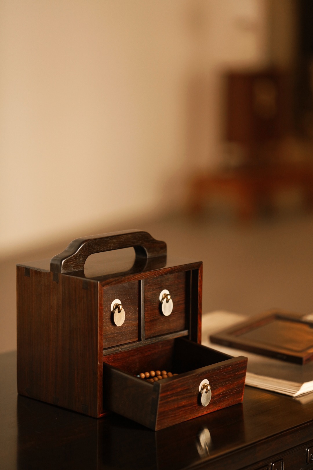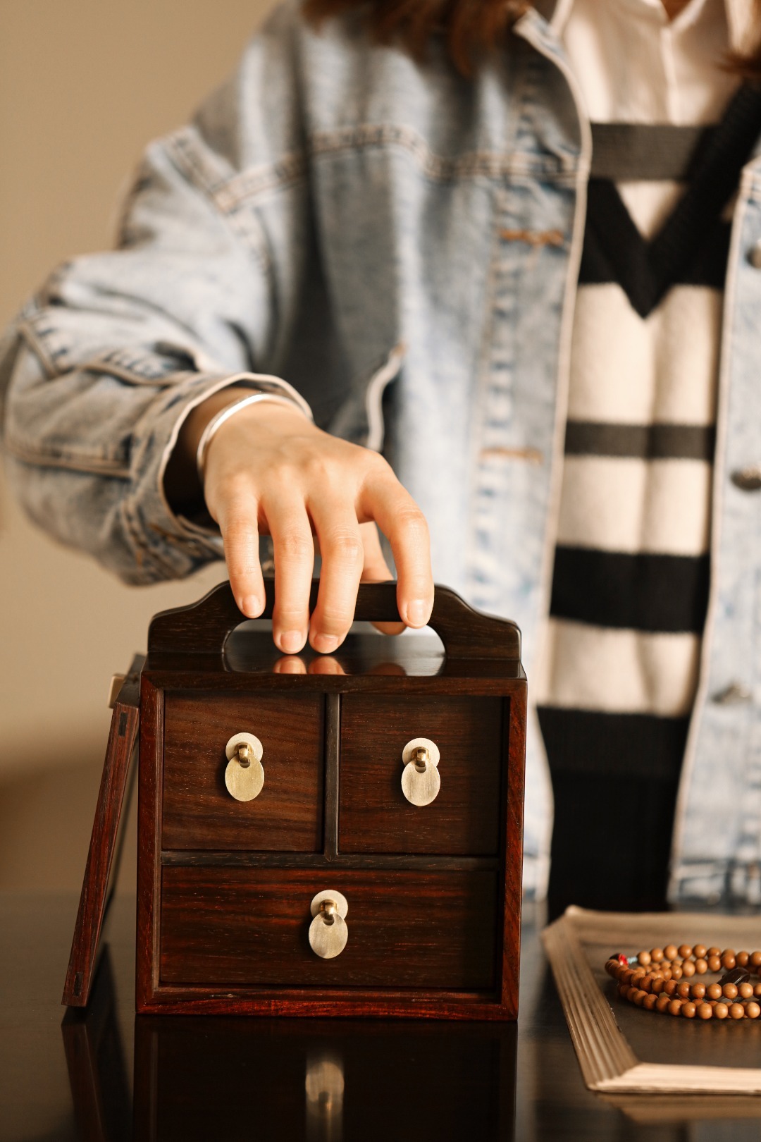大红酸枝【怡轩】提盒大红酸枝老料制作,榫卯精工,铜饰平镶,工艺谨严考究,提梁趁手,内设多格,收纳雅物珍玩,古韵十分。15.5*12.4*16.6cm 重1415g 大红酸枝【怡轩】提盒