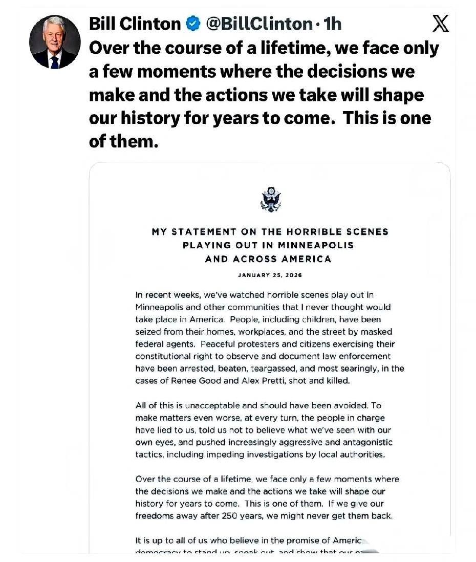 克林顿一篇声明,撕开了一个可怕的口子。 克林顿:联邦特工让暴徒做的事儿!要比他们自己做的还要恶劣百倍千倍。 声明中揭露:联邦特工不但在街上、办公室、家中强行抓人,甚至连孩子也不放过。 试图拍摄证据的和平抗议者,连记者也没能幸免。 “他们就像捕猎的野兽,不择手段。 ”儿童、婴儿被撇在一边。 试图拍摄证据的和平抗议者,连记者也没能幸免。“ 蕾妮·古德和亚历克斯·普雷蒂两人死于枪声之中。 其它和平抗议者刚被逮捕,就遭到催泪瓦斯和警棍的袭击。 警察局长却说:“你们看到的都不是真的。 ”当权者用冷静的语气说出最不寒而栗的话:“你们看到的都不是真的。 ”阻止地方当局调查,形同用枪指着你头说:一切都好! 以上文字来自《克林顿:联邦特工让暴徒做的事儿!要比他们自己做的还要恶劣百倍》 麻烦看官老爷们右上角点击一下“关注”,既方便您进行讨论和分享,又能给您带来不一样的参与感,感谢您的支持!
