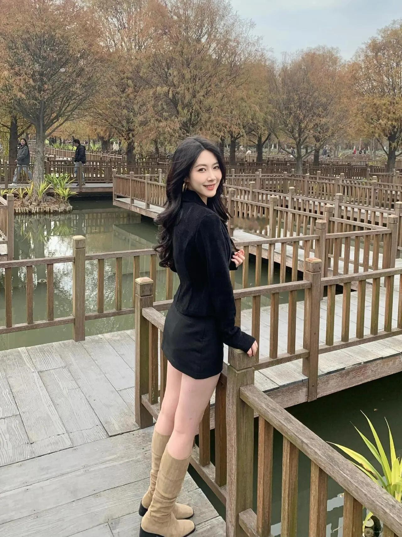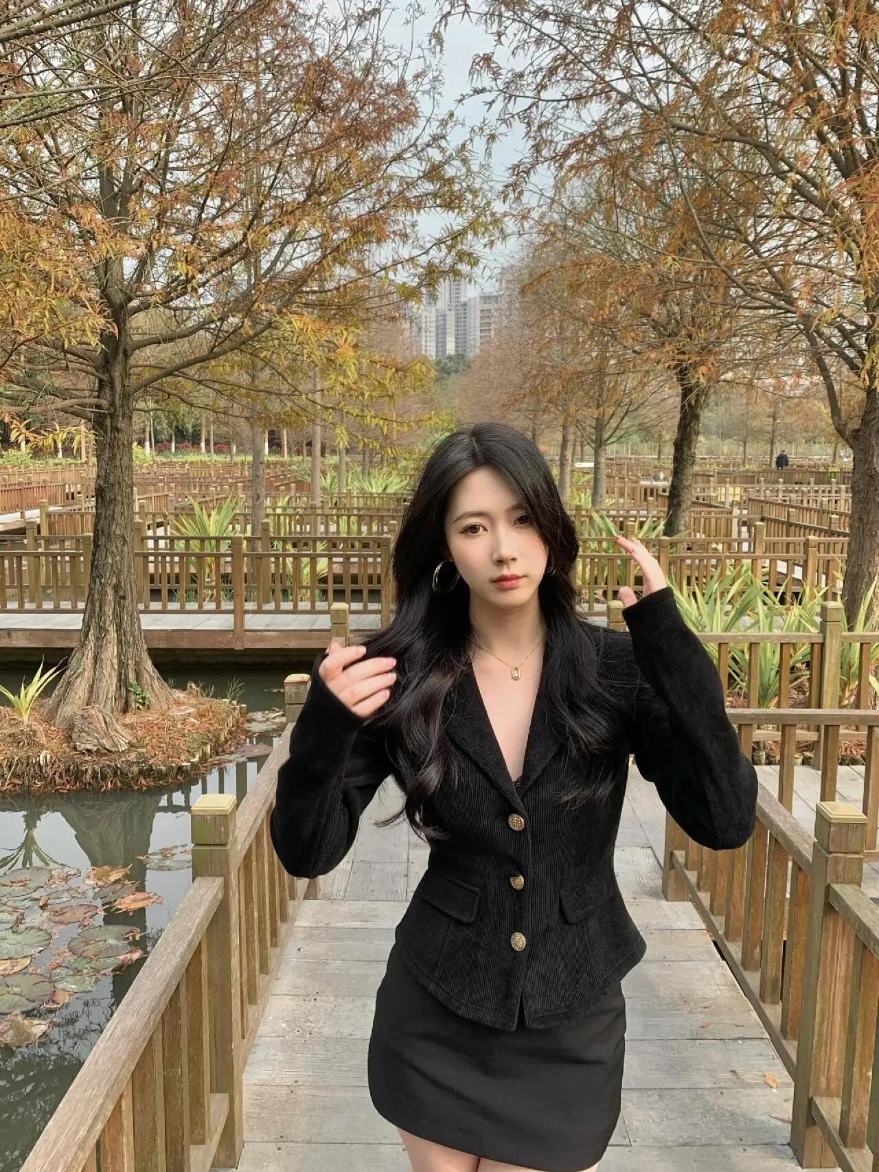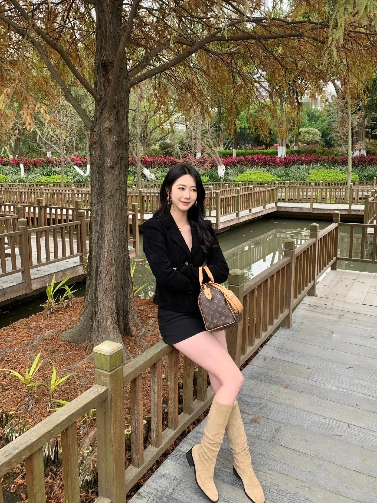 秋日公园里的时尚穿搭,黑西装与棕色靴子的完美搭配