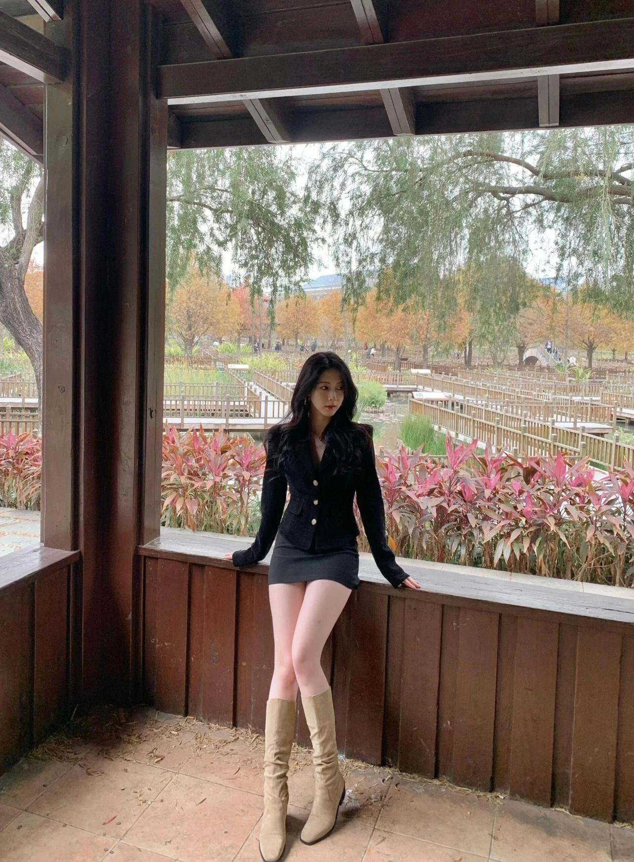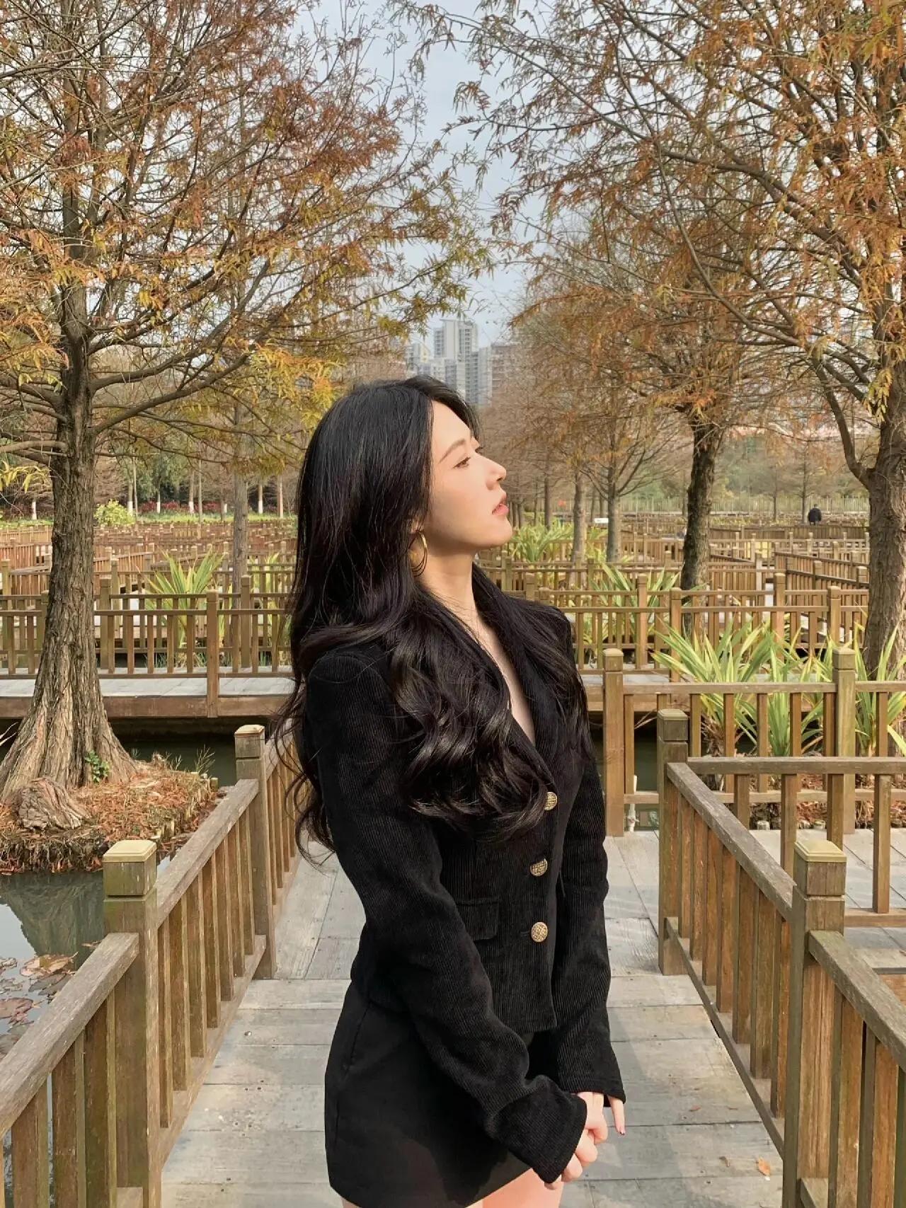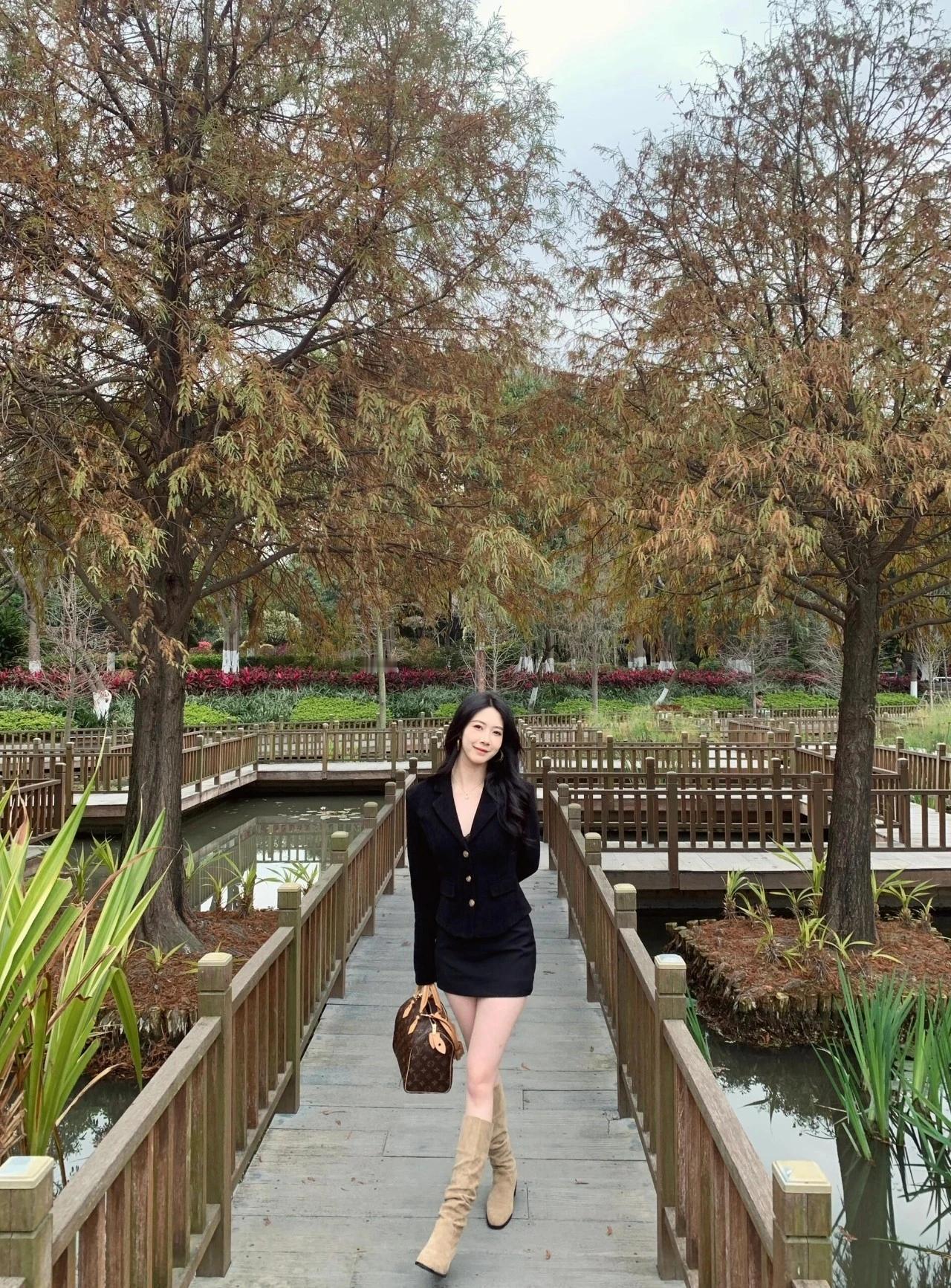 秋日公园里的时尚穿搭,黑西装与棕色靴子的完美搭配