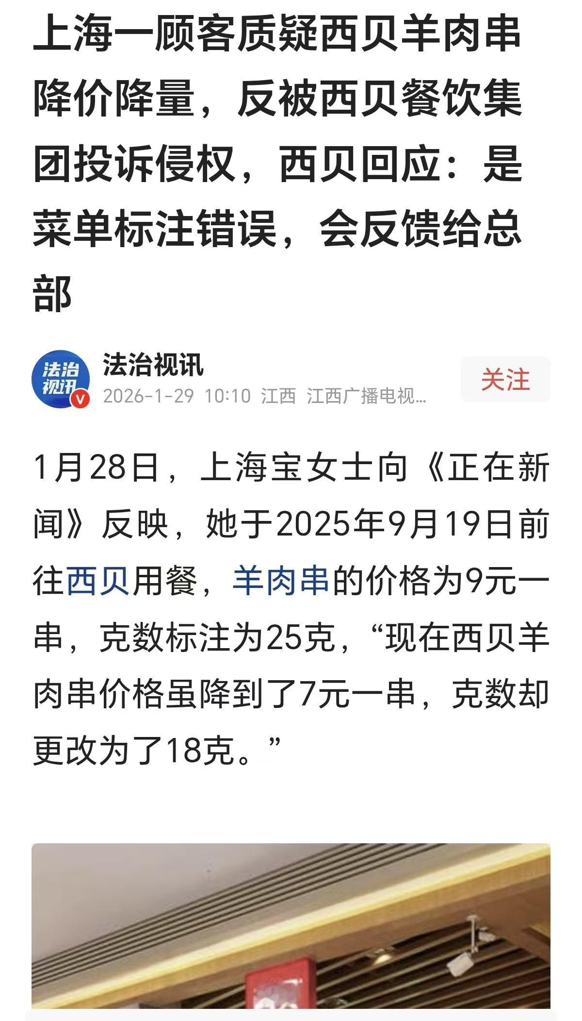 把我看懵了!顾客宝女士明明没错,西贝也承认是菜单标注错了,但为什么还要投诉宝女士侵权呢? 宝女士为什么会在社交媒体上质疑西贝降价降量? 因为去年9u月19日,她去西贝餐厅用餐了,羊肉串是9元/串,25克,但现在是7元/串,18克。 这不就是降价也降量了吗? 如果我们细算会发现,其实也是涨价了。 西贝把宝女士投诉了,说她侵权。 我没弄明白,西贝所谓的侵权指的是什么。 西贝的解释是,现在并不是每串18克,而是28克,是菜单标注错了。 按照这个解释,羊肉串是降价加量了,而不是宝女士所说的降价降量了。 这也不能怪宝女士呀! 就像西贝自己承认的一样,是菜单标注错了。 她只能看菜单上的标注,总不能自己去称一下每串羊肉串的重量吧? 既然事实如此清楚,西贝为什么还要投诉宝女士呢? 按我想的,西贝应该感谢宝女士才对,因为如果不是她的质疑,西贝还没发现菜单标注错了呢! 自己的错,却要投诉顾客,这是什么逻辑?