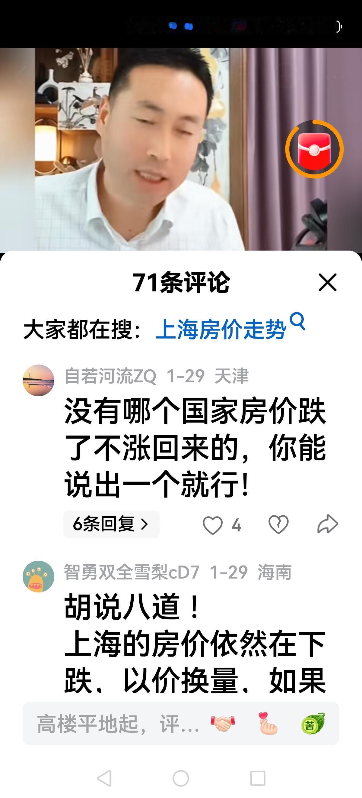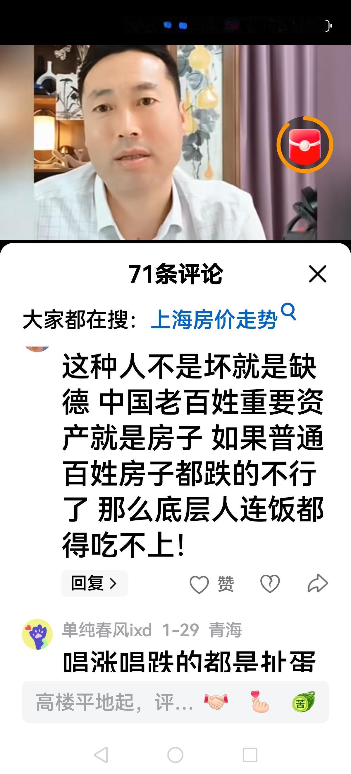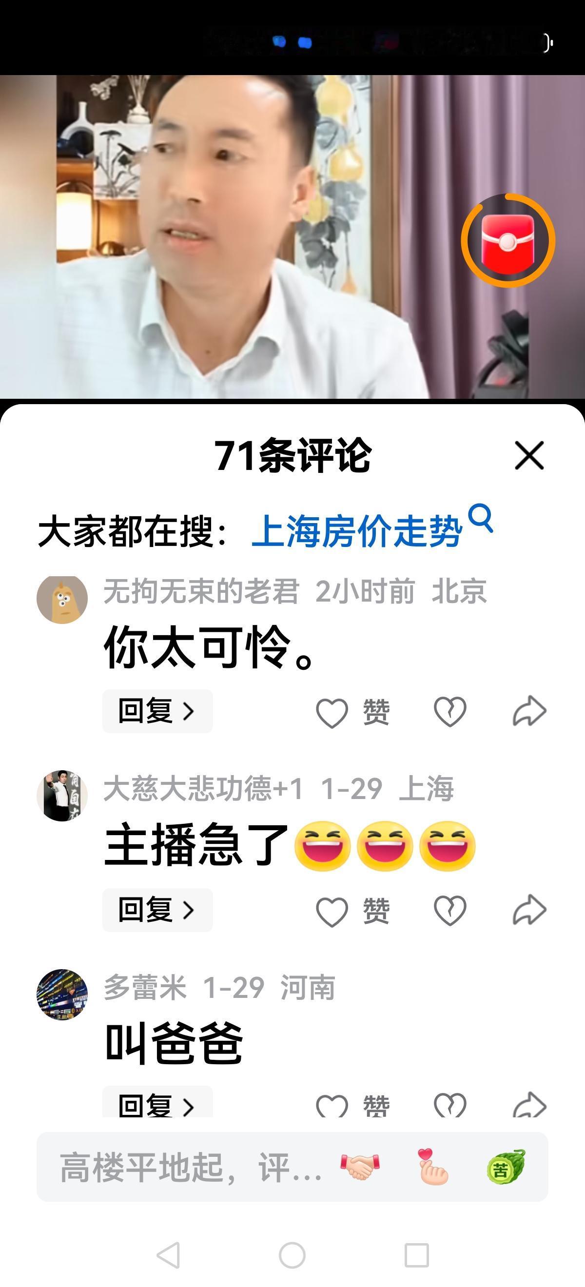 【北哥也急眼了】 北哥直播间,有人提醒上海房价开始涨了,有人问北哥你说上海房价除以3呢? 看着网友调侃或者犀利发问,北哥急眼了,他脸红脖子粗回应:涨就涨呗,别以为涨两个月让你开心开心,你看着吧,马上下跌五个月,每年如此…… 随着上海房价(新房)企稳,上涨,北哥很多大胆预测都破产了,但不认错还在强词夺理,网友不买账了: 老北,其实上海涨不涨跟你没啥关系,用不着动这么大的肝火,你看你的脸色不大对劲 网上聪明的无房者嘲笑愚蠢的有房者,现实中聪明的无房者每个月交租给愚蠢的有房者 这种人不是坏就是缺德,中国老百姓最重要的资产就是房子,如果普通老百姓的房子都跌得不行了,那底层人连饭都得吃不上。 看来很多网友开始清醒了,北哥除以2,除以3的理论被击碎后依旧不认错,有的网友总结很到位: 一手房一直在涨,二手房一直在跌。所以北哥分析房价要客观,要调查研究,不要迎合一部分人大放厥词唱衰房地产,你没有那个本事。