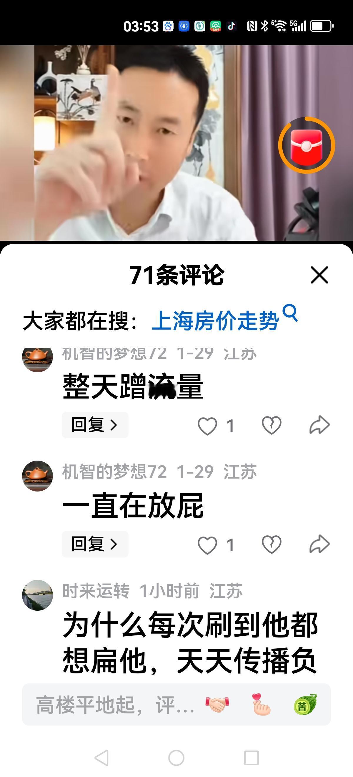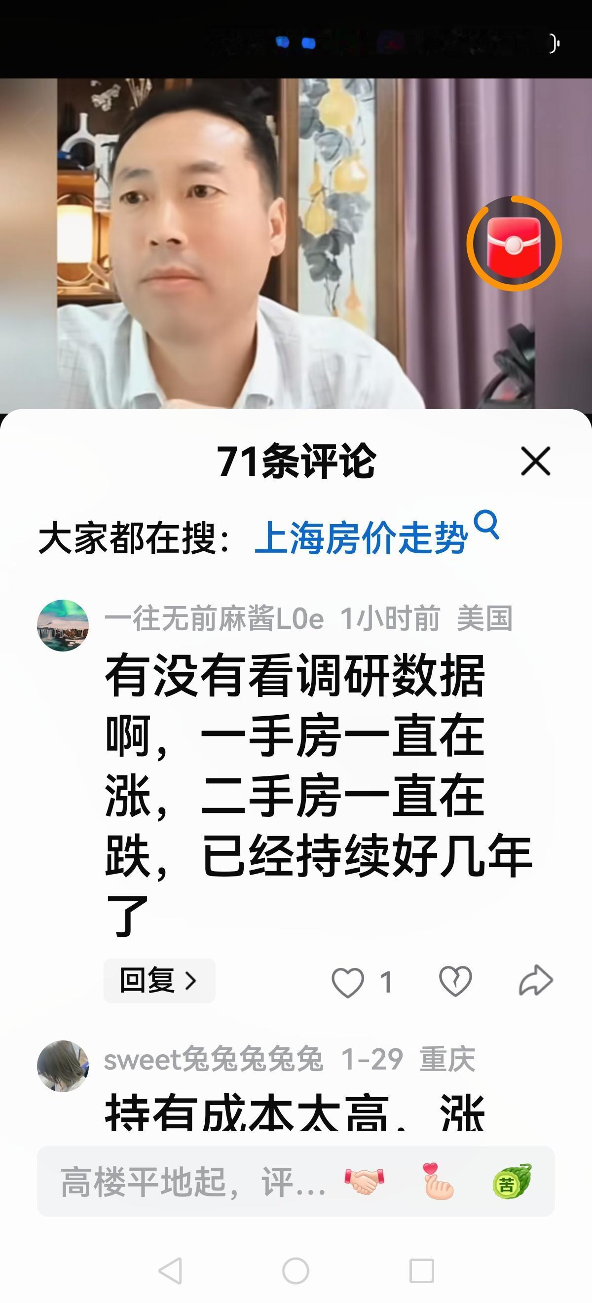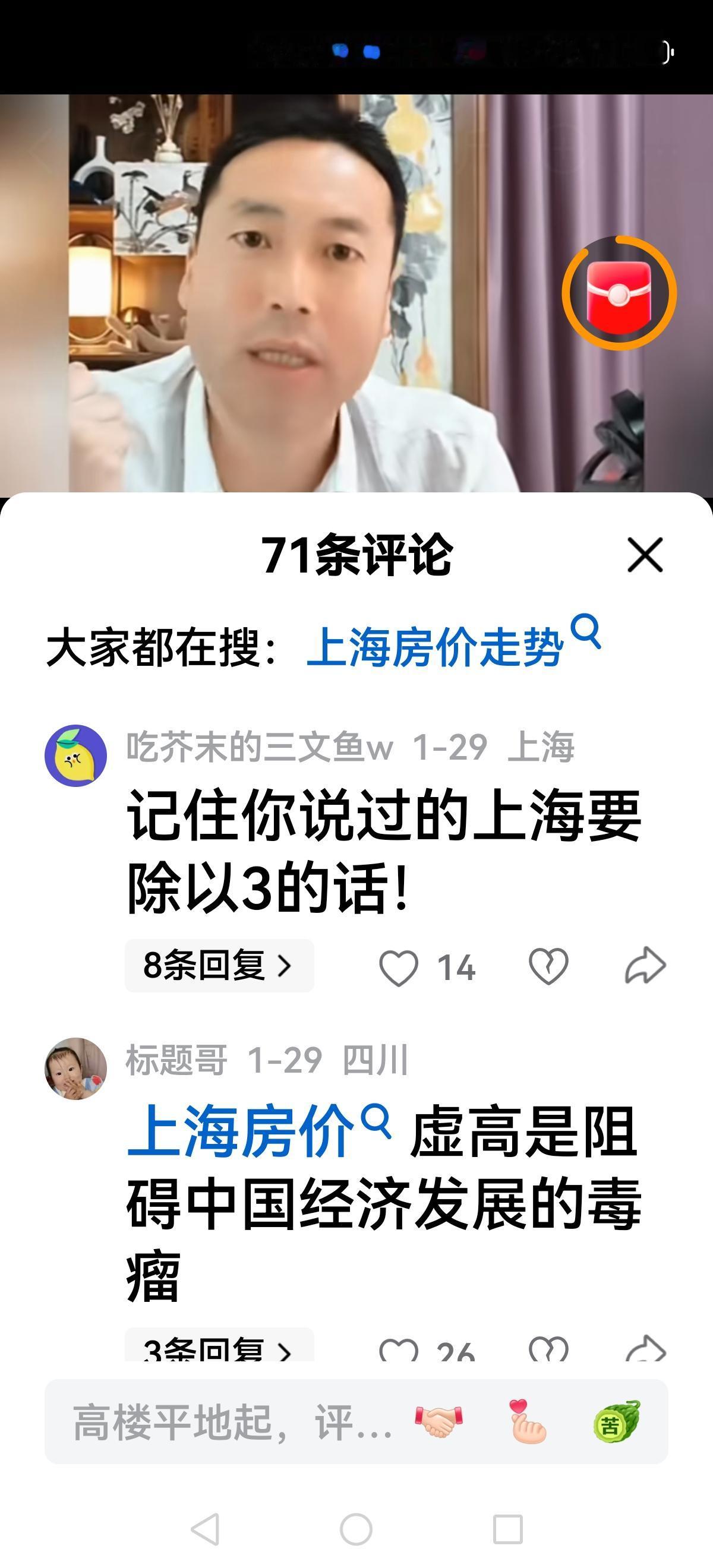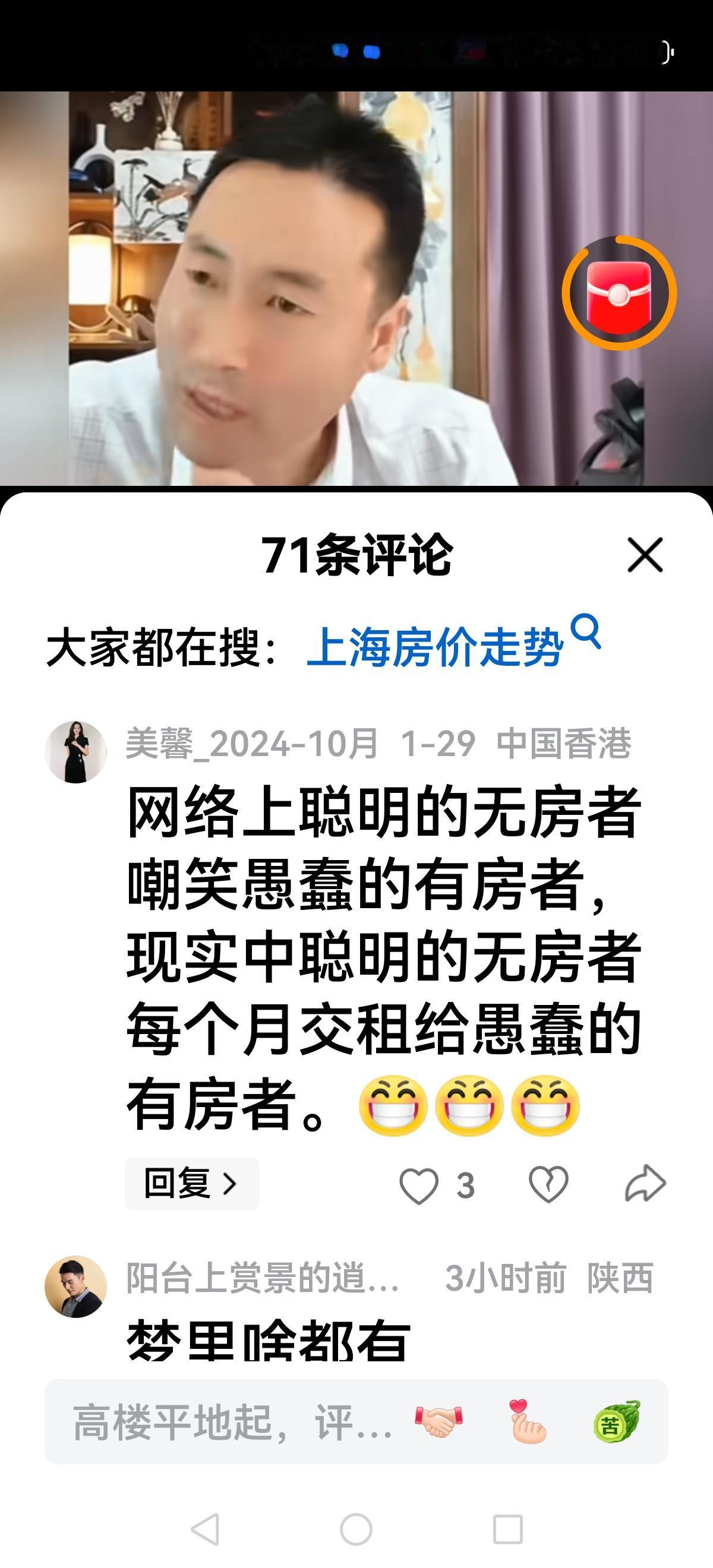 【北哥也急眼了】 北哥直播间,有人提醒上海房价开始涨了,有人问北哥你说上海房价除以3呢? 看着网友调侃或者犀利发问,北哥急眼了,他脸红脖子粗回应:涨就涨呗,别以为涨两个月让你开心开心,你看着吧,马上下跌五个月,每年如此…… 随着上海房价(新房)企稳,上涨,北哥很多大胆预测都破产了,但不认错还在强词夺理,网友不买账了: 老北,其实上海涨不涨跟你没啥关系,用不着动这么大的肝火,你看你的脸色不大对劲 网上聪明的无房者嘲笑愚蠢的有房者,现实中聪明的无房者每个月交租给愚蠢的有房者 这种人不是坏就是缺德,中国老百姓最重要的资产就是房子,如果普通老百姓的房子都跌得不行了,那底层人连饭都得吃不上。 看来很多网友开始清醒了,北哥除以2,除以3的理论被击碎后依旧不认错,有的网友总结很到位: 一手房一直在涨,二手房一直在跌。所以北哥分析房价要客观,要调查研究,不要迎合一部分人大放厥词唱衰房地产,你没有那个本事。