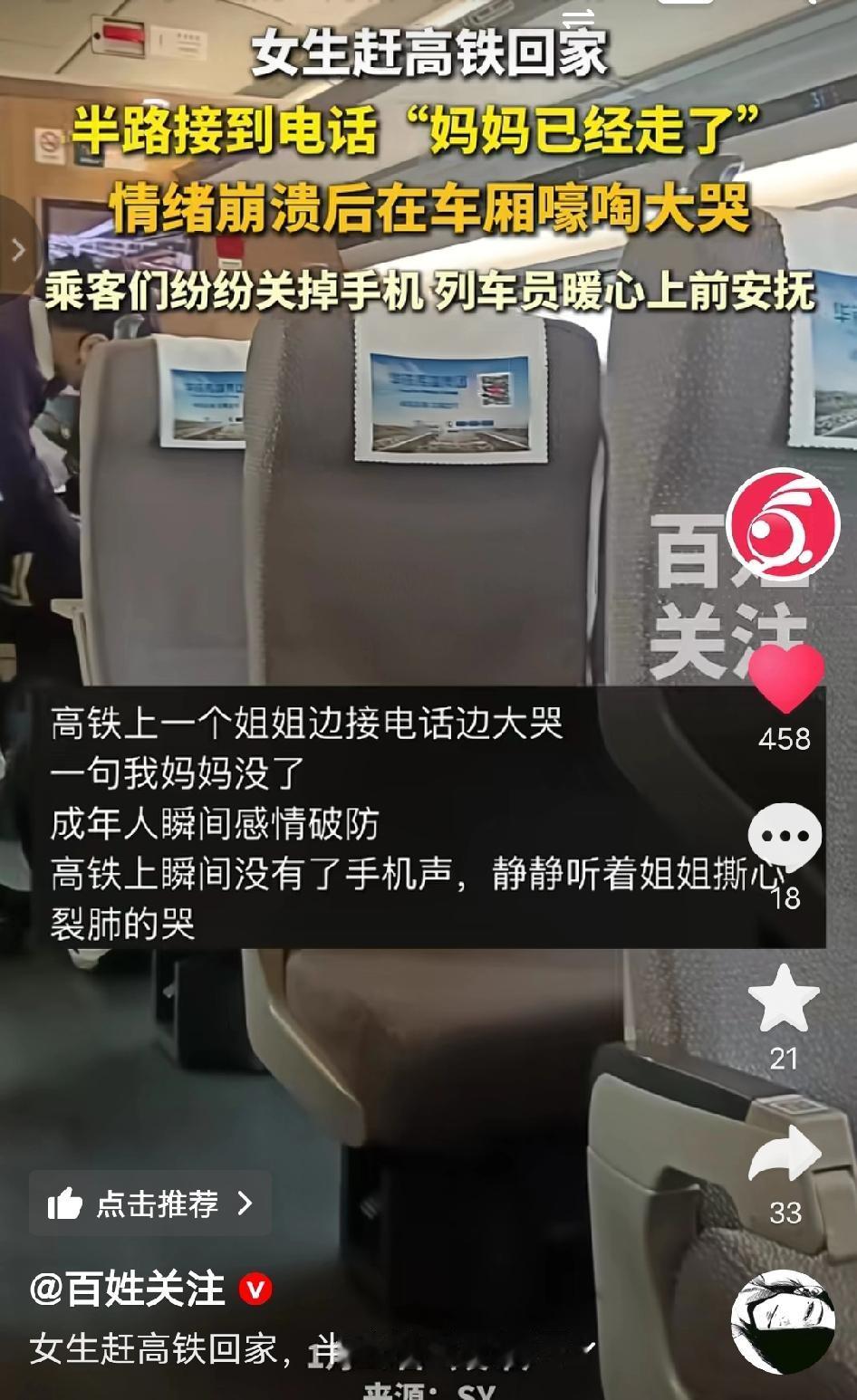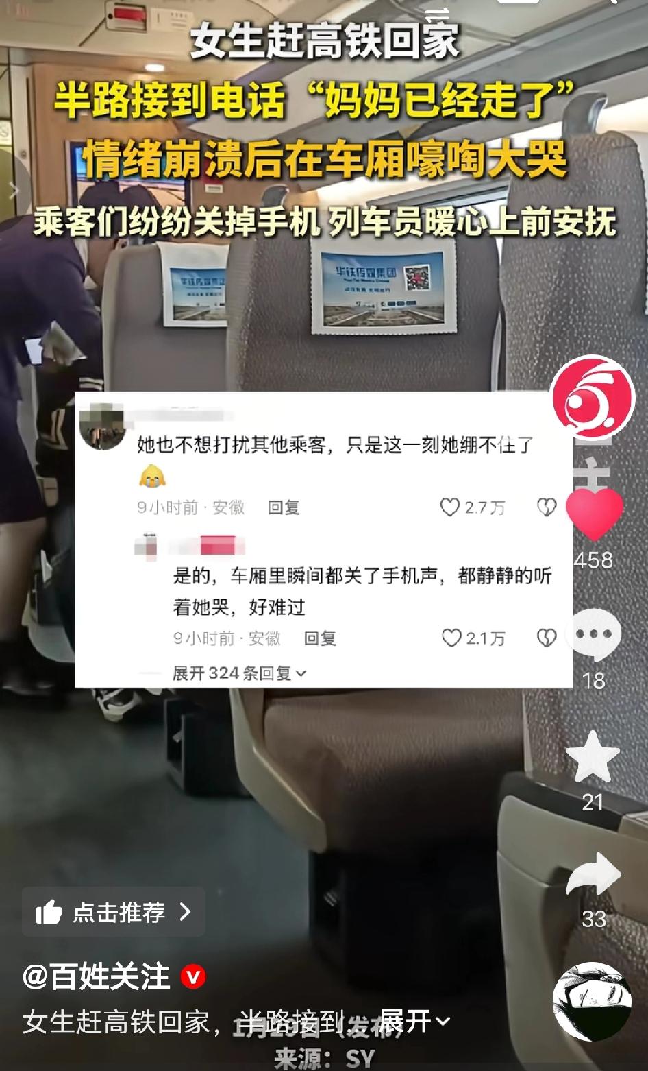 破防了!安徽高铁上,一名女孩接到母亲离世的电话后当场崩溃哭喊,全车乘客竟不约而同地关了手机、暂停视频,用一整节车厢的沉默守护她的悲伤!这一幕看哭无数网友:突然想回家了! 1月29日,安徽境内一列飞驰的高铁上,一名女乘客正戴着耳机刷着手机,原本平静的脸上突然血色尽失。 电话那头传来的噩耗让她瞬间崩溃,她猛地摘下耳机,趴在座位上撕心裂肺地哭喊:“我妈妈没了……我还没赶回家……” 哭声穿透了车厢的嘈杂,周围原本在刷视频、打电话的乘客,纷纷下意识地按下了暂停键,悄悄关掉了手机外放,连正在聊天的人也没了声音。 短短几秒钟,原本喧闹的车厢陷入了一片安静,没有人上前打扰,也没有人投去异样的目光,只有无声的陪伴,给这个崩溃的女孩留足了释放情绪的空间。 列车员很快赶到,蹲在女孩身边轻声安抚,递上纸巾和热水,直到她的哭声渐渐平复。 这段视频被邻座乘客悄悄拍下上传后,瞬间引发全网共情,无数人被这无声的温柔戳中了泪点。 有网友说“我都跟着哭了,年纪越大,越害怕这一天!” 也有网友说“4年前我老爸去世时,我在外国因为疫情回不去,那一夜我也是这样嚎啕大哭的。那时我已经48岁了,妈妈电话里说爸爸走之前一直喊着我的名字……. 还有网友说 “看的鼻子一酸!突然想回家了” 高铁上的无声温柔 陌生人的暖心瞬间 成年人的崩溃 安徽高铁暖心事件 暖心民生 来源:百姓关注 及网络公开内容,如有侵权请联系即删 配图说明:本文配图/视频素材来自@ 百姓关注 ,仅用于内容分享,侵权联删