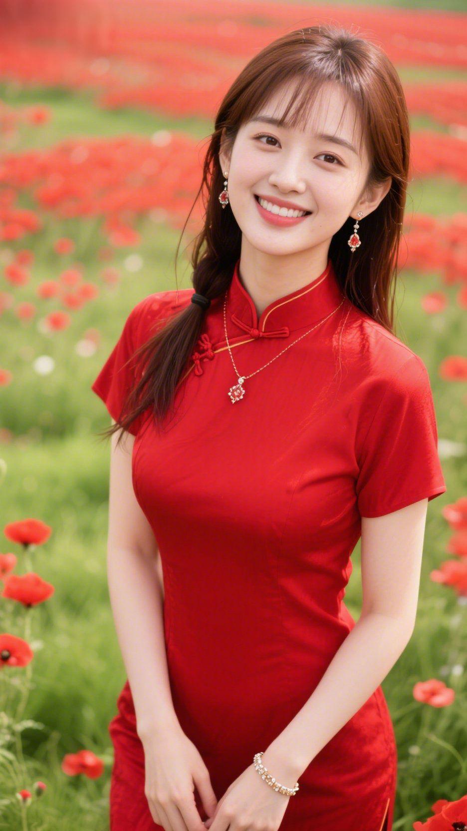 《红衫伴花春》 漫野红瓣裹着春的软香,她立在花田间,像把日光的暖揉作一身舒展的红意。 旗袍衬着自在的模样,盘扣轻缀的细节裹着温软的柔,发辫轻垂时,周遭的风都跟着放柔了节奏。笑意漫开的瞬间,眼底的亮像落了细碎的光,裹着郊野里的鲜活平和。 这不是张扬的色调,是把生活的舒展藏进衣褶里——抬眸时的柔和,浅笑时的轻缓,都是恰好的松弛,是能让人跟着轻浸在春日光景里的暖。 红衫栖春野 松弛感日常