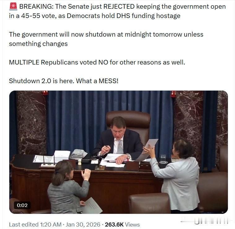 突发新闻:参议院刚刚以45票对55票否决了维持政府运转的法案,民主党人以此要挟国土安全部(DHS)拨款。 除非情况发生变化,否则政府将于明天午夜停摆。 多名共和党人也因其他原因投了反对票。 停摆2.0来了。真是一团糟!