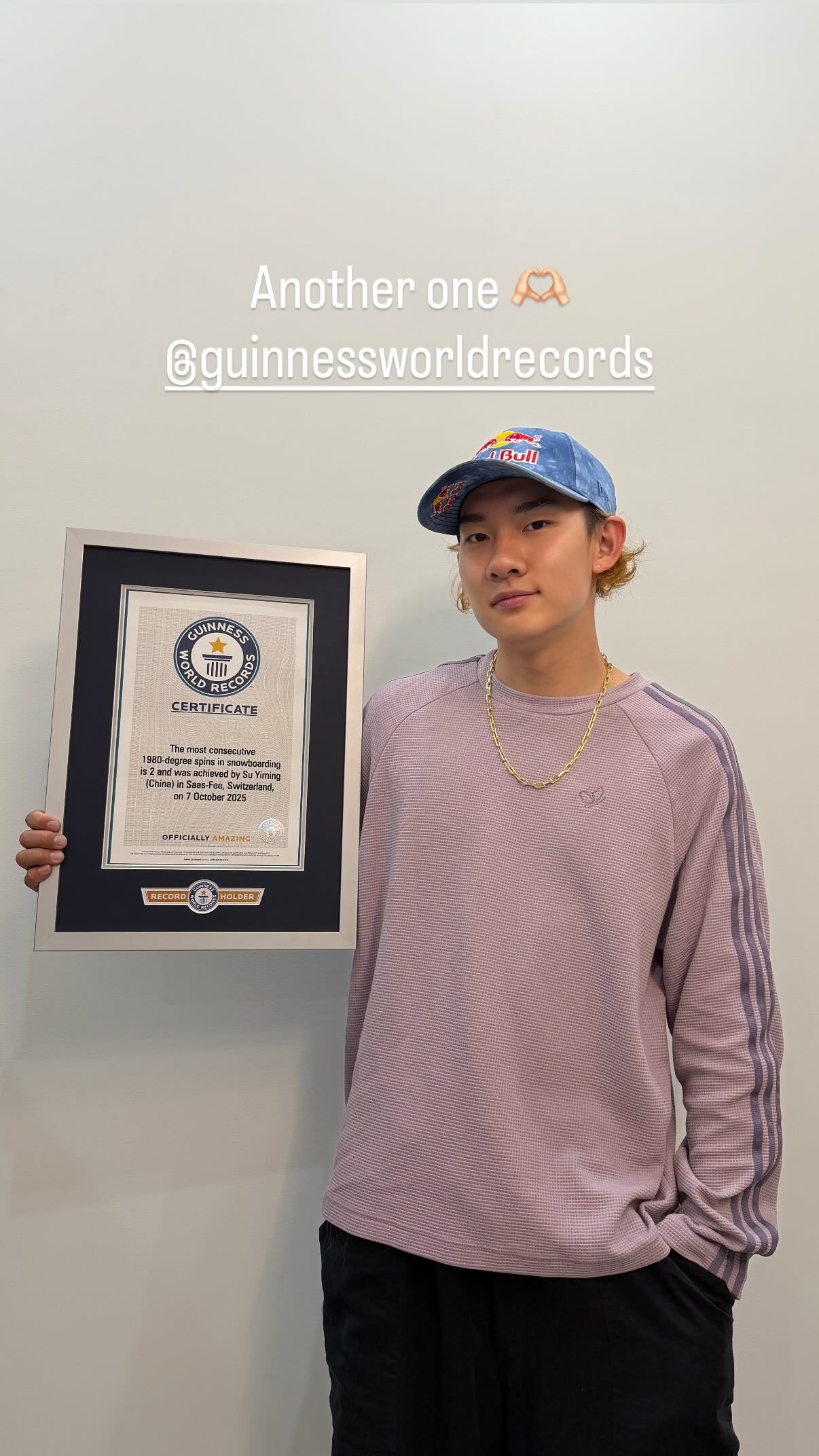 #苏翊鸣手握两项吉尼斯世界纪录# 更新社媒,晒出自己的吉尼斯证书苏翊鸣手握两项吉尼斯世界纪录:一次连贯滑行内完成单板滑雪1980度转体次数最多+首个完成内转1980抓板动作的运动员2月5日-23日,全场次直播米兰冬奥会,欢迎届时收看#还有一周米兰冬奥会开幕# #看冬奥上咪咕#
