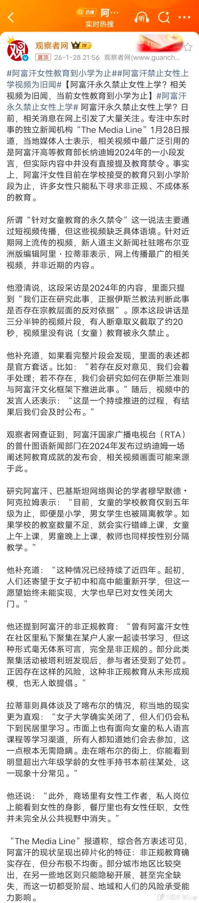 阿富汗永久禁止女性上学观察者网的报道和其他媒体不太一样总的来说,这个标题很有误导性。实际情况和媒体、自媒体炒作的有一些出入。