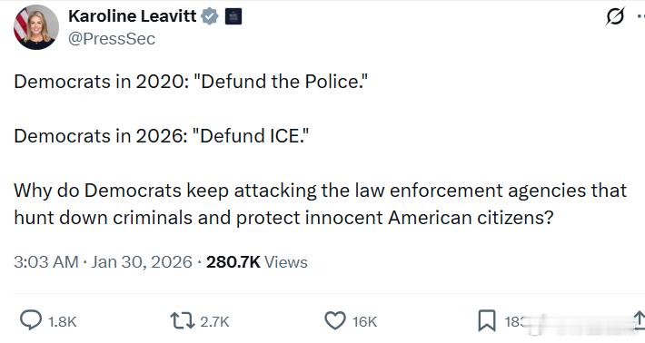 2020年的民左党:“削减警察经费。”2026年的民左党:“削减 ICE 经费。”为什么民左党总是攻击那些追捕罪犯、保护无辜人民的执法机构呢?