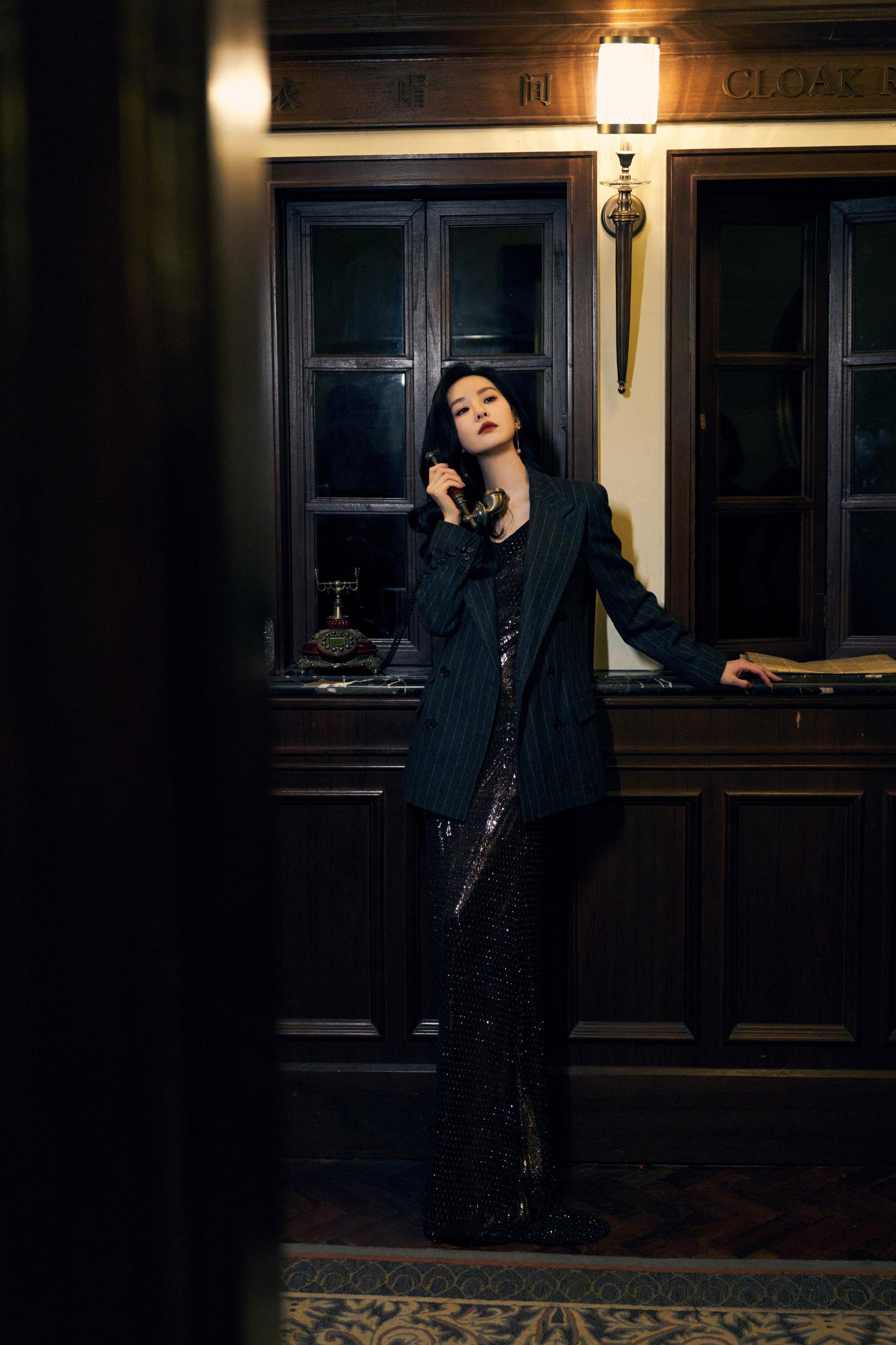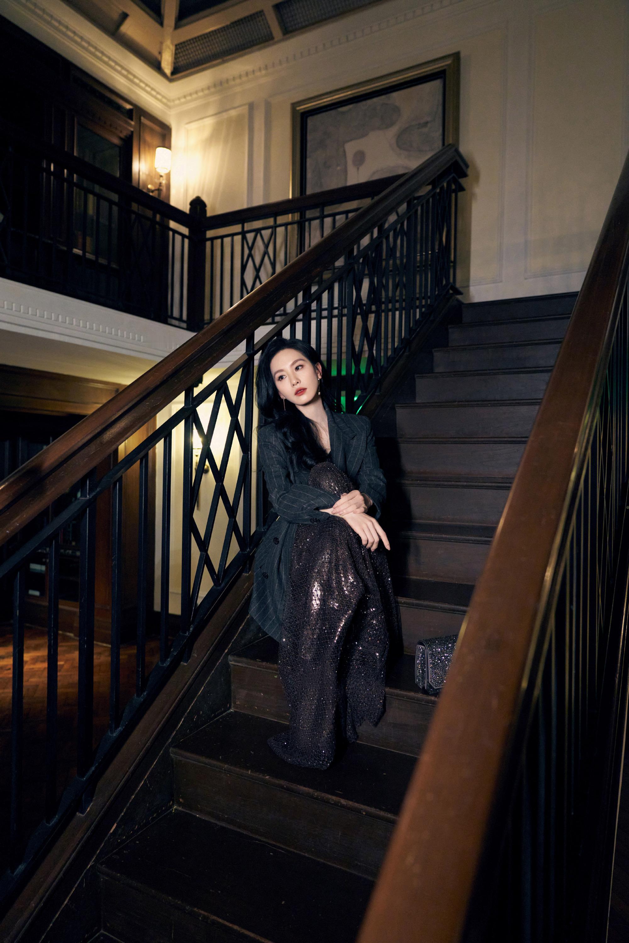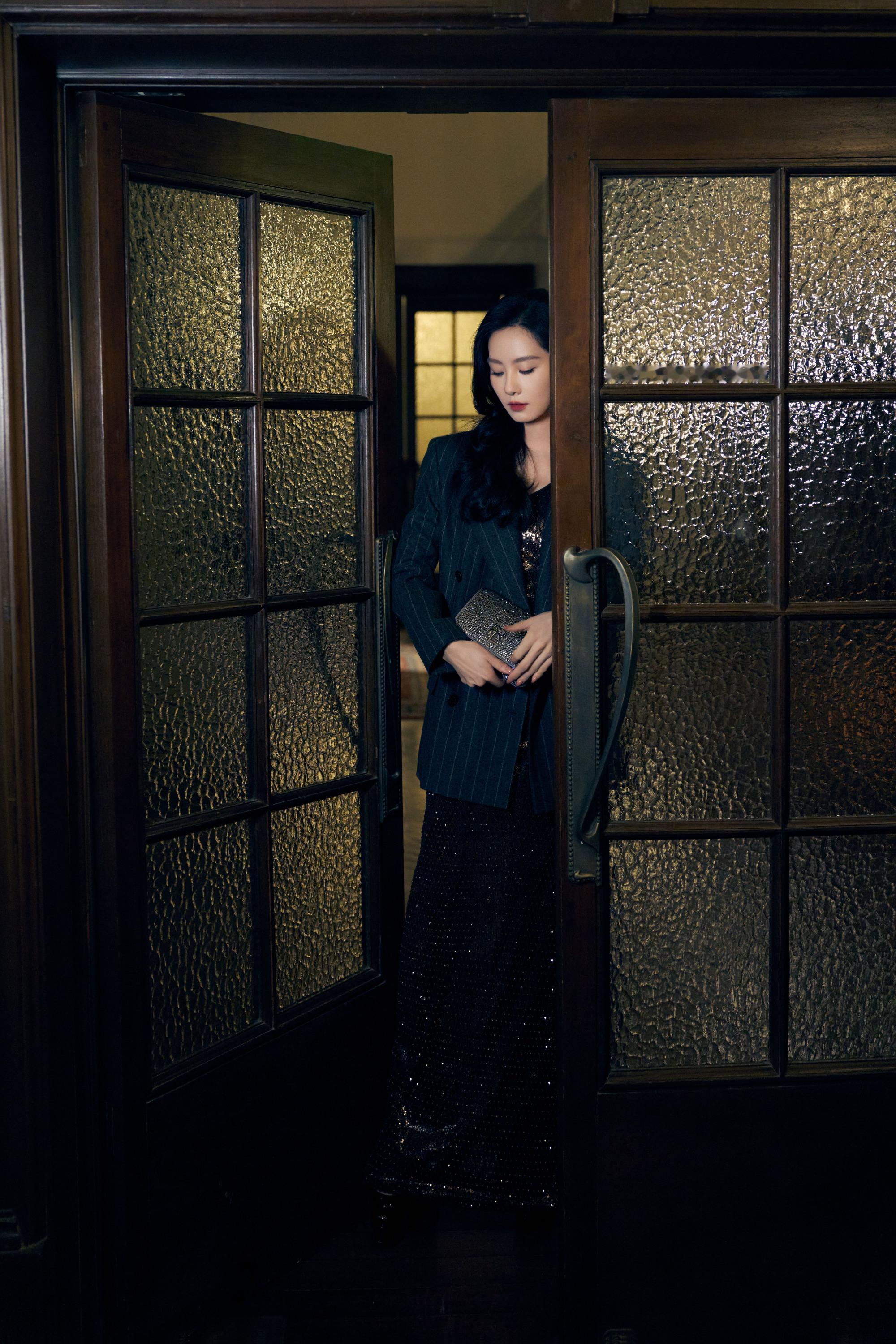 刘诗诗条纹西装,鎏金亮片随身形闪烁,静谧而迷人。刘诗诗