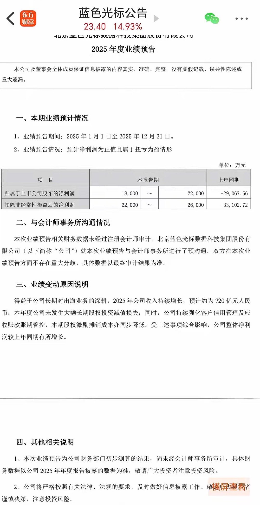 蓝色光标昨晚公布的业绩预告绝还是有问题!前三季报盈利已经是1.96亿,而今天晚上公布的全年业绩预告是1.8亿到2.2亿。前三季报盈利,当时我记得公司的说法是AI应用引导业务暴增,利润比传统业务高很多。按照公司公布的调用token数量,四季度token调用数量占全年比例达40%,应该四季度大幅盈利才对。可在目前看盈利上并没有体现出来。问题在哪里?