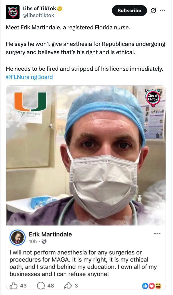 新闻快讯——佛罗里达州护士因拒绝为MAGA患者提供服务被吊销执照 2026年1月29日,美国佛罗里达州总检察长詹姆斯·乌斯迈尔宣布,正式吊销护士麻醉师埃里克·马丁代尔的执业执照。 马丁代尔此前在社交平台发文称,将拒绝为支持“MAGA(让美国再次伟大)”的患者实施麻醉,并声称这是其“权利”与“道德誓言”。该言论经“Libs of TikTok”曝光后引发舆论强烈反响。 州总检察长办公室明确表态:“医疗服务不应取决于政治信仰”,并强调对“将政治置于伦理职责之上的极端分子零容忍”。这一事件再次凸显了美国社会政治极化对医疗等公共服务领域的冲击,引发了关于医疗伦理与患者权益的广泛讨论。 消息来源RT