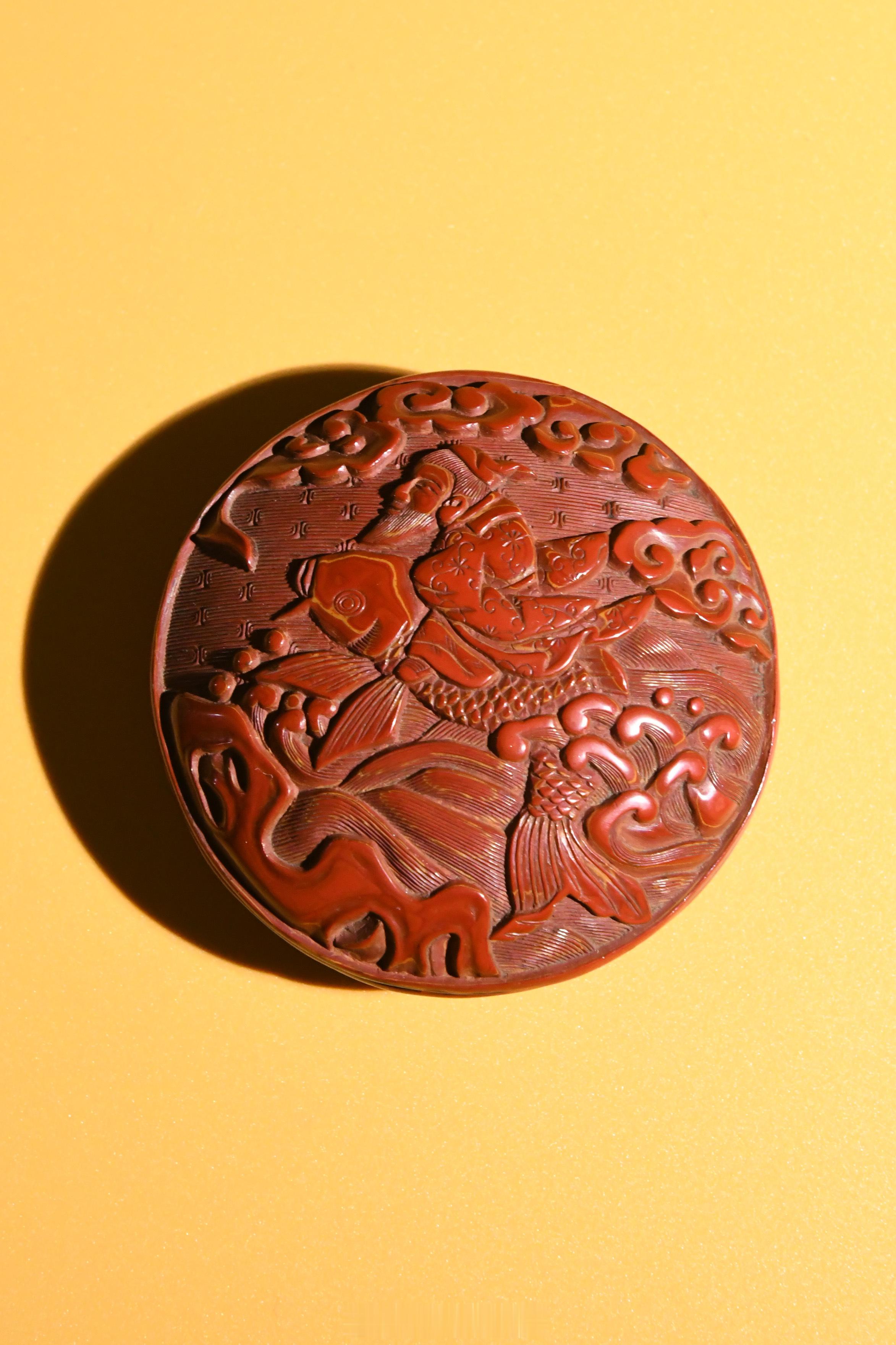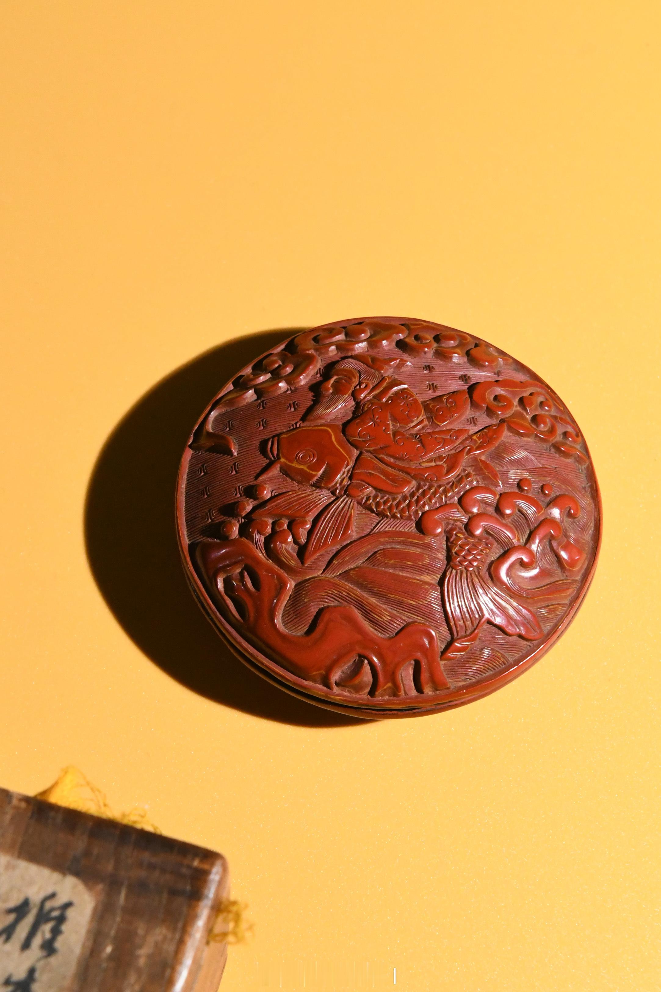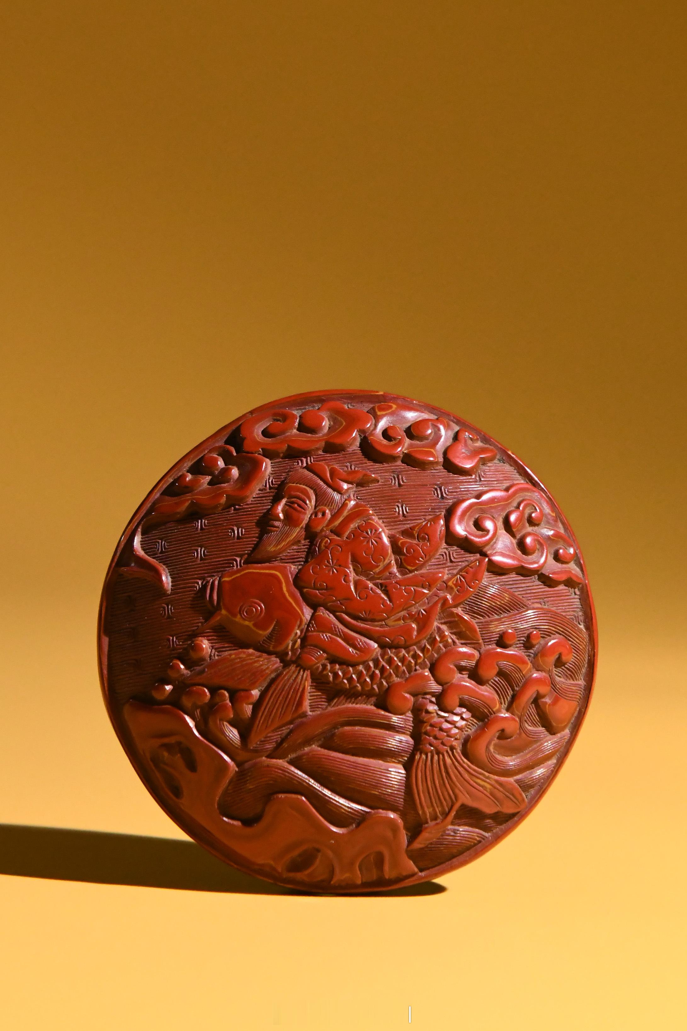 髹饰录 | 清 剔红仙人乘鲤香盒香盒以木为胎经旋制髹漆剔刻而成。圆形扁体,球面,弧壁,下设小圈足。盒面以剔刻手法表现"琴高乘鲤图",画面中,一位长者头戴尖帽身着长衣跨鲤飞行于浪涛之间,身下一条硕大的鲤鱼越身而起,周边,波涛汹涌浪花四溅,险象环生,紧张刺激。盒身外壁则剔刻以卷云纹。"琴高乘鲤"是我国古代传说之一。汉代刘向《列仙传》记载:"琴高者,赵人也,以鼓琴为宋康王舍人,行涓彭之术,浮游冀州,涿郡之间二百余年。后辞入涿水中取龙子,与诸弟子期曰:'皆洁斋待于水旁,设祠。'果乘赤鲤来,出坐祠中,旦有万人观之。留一月余,复入水去。"(刘向《列仙传》)后以此典指得道成仙,入水仙去。尺寸:高:2.8cm 口径:6.7cm 来源:北京博美2024年《尚古存真》