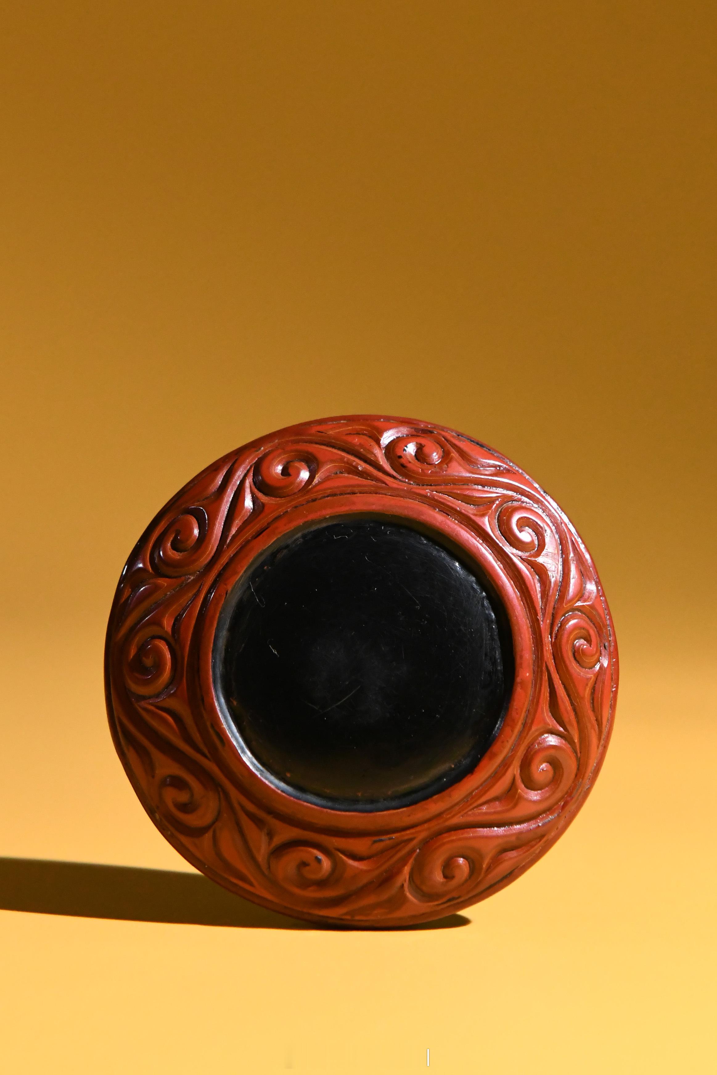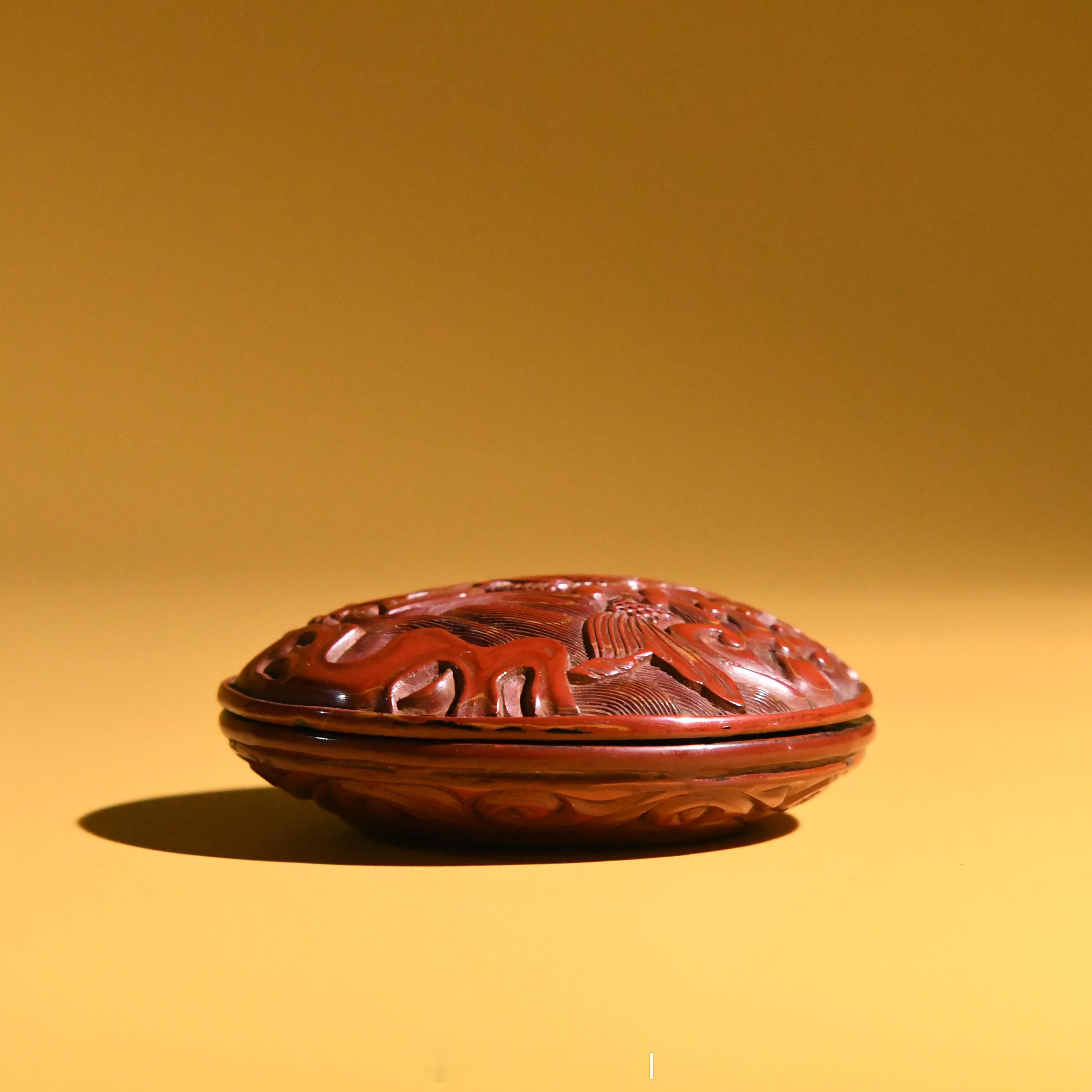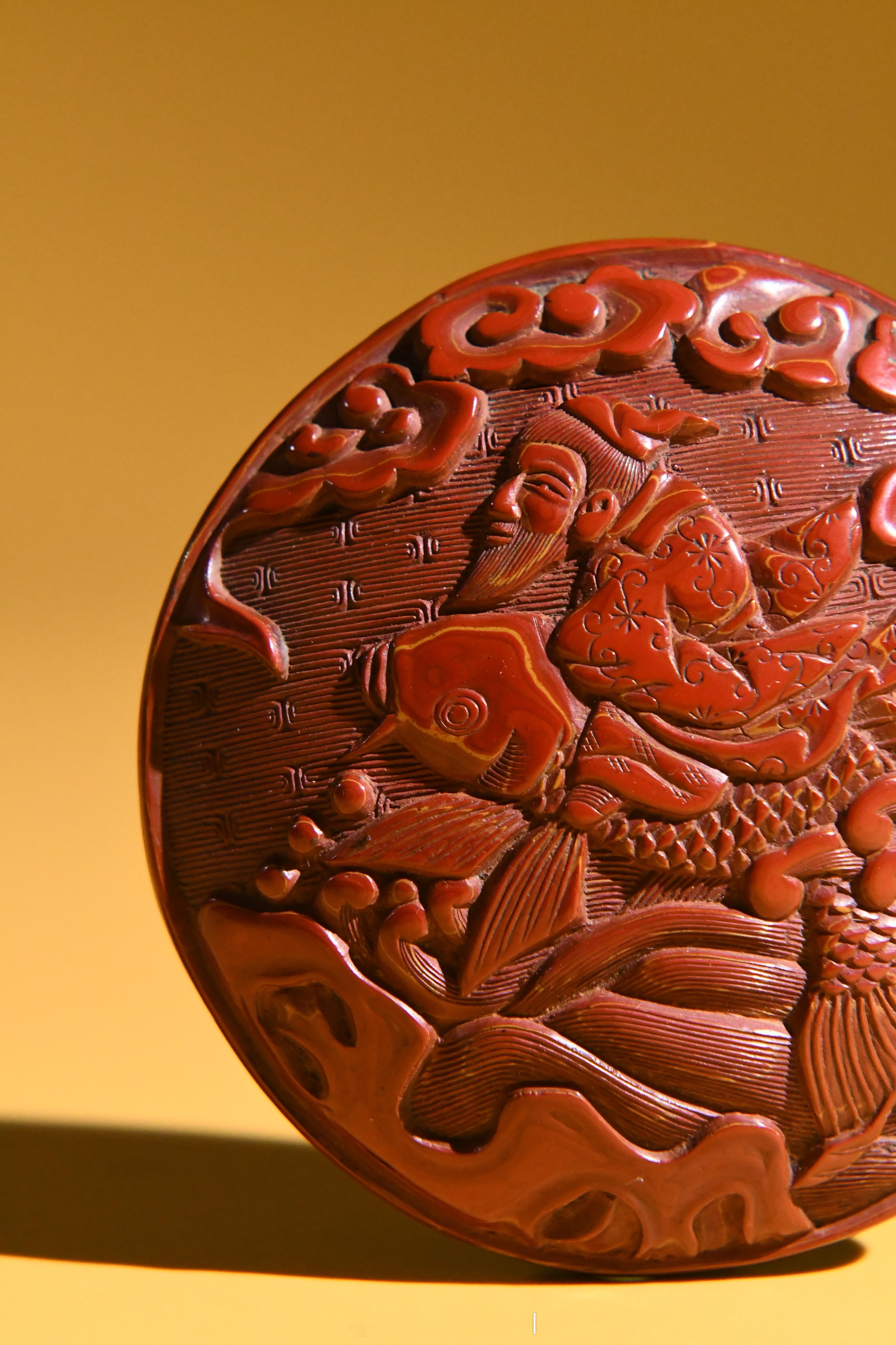 髹饰录 | 清 剔红仙人乘鲤香盒香盒以木为胎经旋制髹漆剔刻而成。圆形扁体,球面,弧壁,下设小圈足。盒面以剔刻手法表现"琴高乘鲤图",画面中,一位长者头戴尖帽身着长衣跨鲤飞行于浪涛之间,身下一条硕大的鲤鱼越身而起,周边,波涛汹涌浪花四溅,险象环生,紧张刺激。盒身外壁则剔刻以卷云纹。"琴高乘鲤"是我国古代传说之一。汉代刘向《列仙传》记载:"琴高者,赵人也,以鼓琴为宋康王舍人,行涓彭之术,浮游冀州,涿郡之间二百余年。后辞入涿水中取龙子,与诸弟子期曰:'皆洁斋待于水旁,设祠。'果乘赤鲤来,出坐祠中,旦有万人观之。留一月余,复入水去。"(刘向《列仙传》)后以此典指得道成仙,入水仙去。尺寸:高:2.8cm 口径:6.7cm 来源:北京博美2024年《尚古存真》