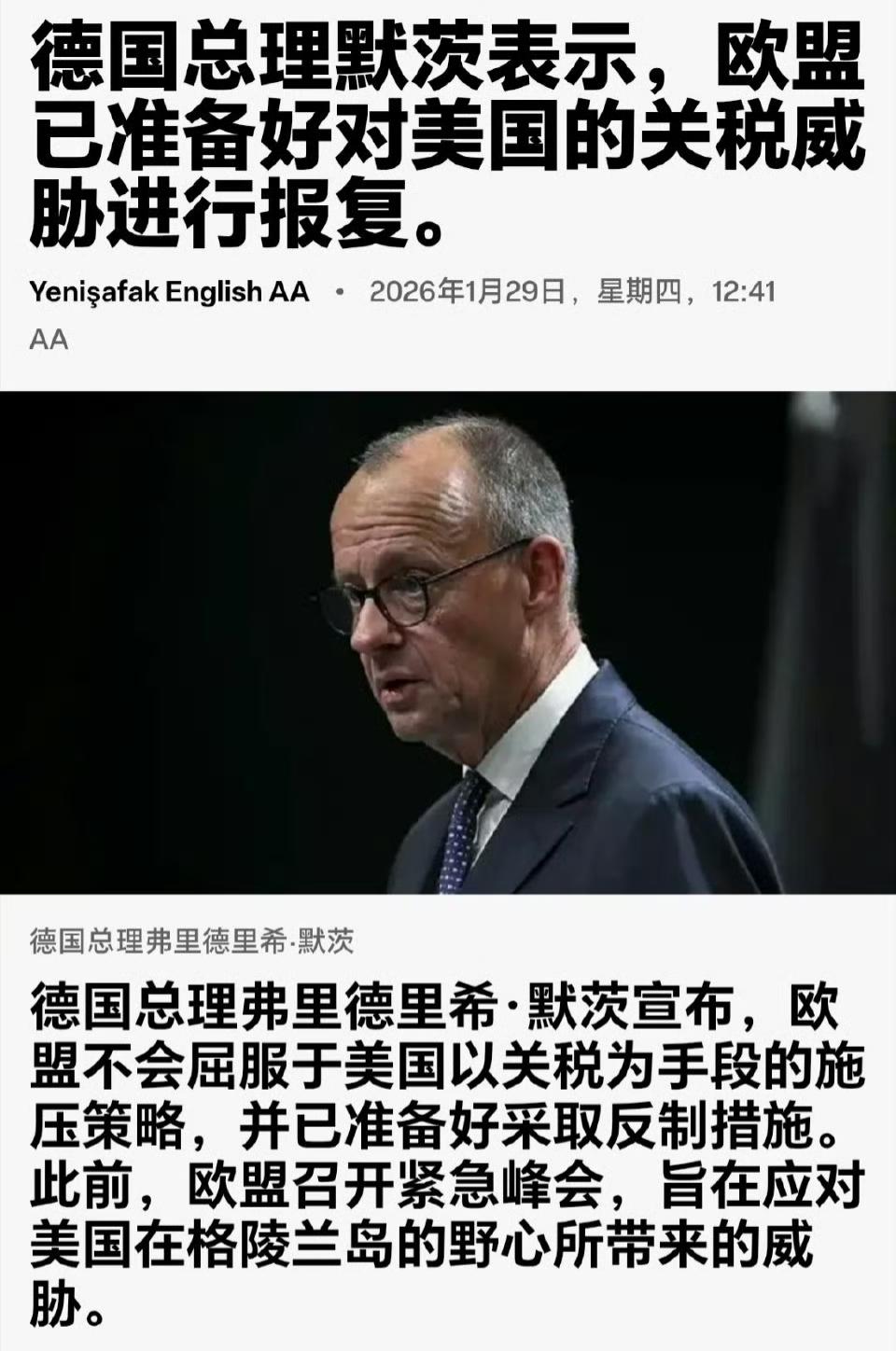 很好,千万别怂!德国总理默茨表示,欧盟已准备好对美国的关税威胁进行报复 。 特朗普政府以“维护北极安全”为由,要求欧洲八国(英、法、德等)同意美国控制格陵兰岛,并于2026年1月宣布分阶段加征关税:2月1日起对八国输美商品加征10%关税,6月1日升至25%。欧盟认定此举违反国际法主权原则,是对欧洲的“经济勒索”。 默茨在联邦议院强调“欧盟不会屈服于胁迫”,但私下向内阁通报时称“不希望事态升级”,仅在必要时反制