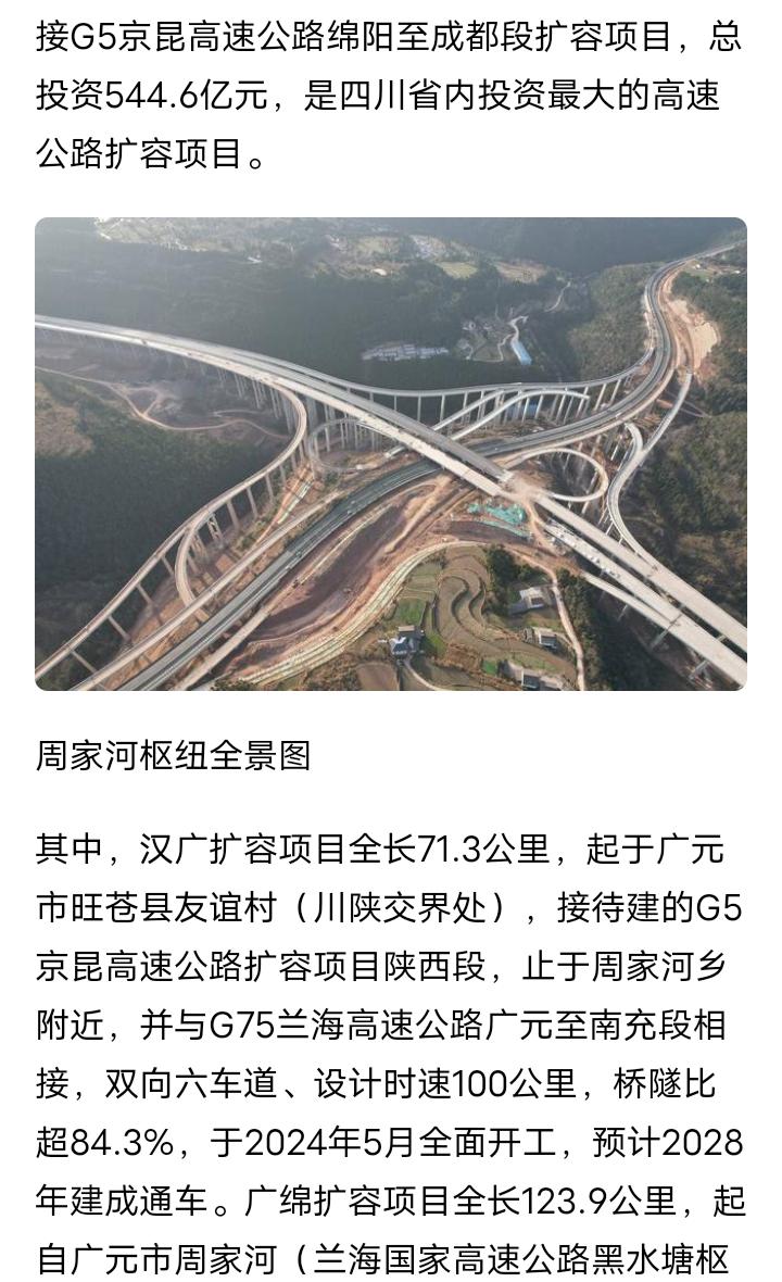 G5京昆高速绵阳途经广元至汉中段(川陕界)扩容项目周家河枢纽架梁已经完成,全长约1.6公里的新桥坝特大桥右幅已经顺利合龙,全线控制性工程全长约6.2公里的天星隧道和全长约4.3公里的飞鹰关隧道正在全速挖掘中,绵阳至广元段已经开始大面积铺设沥青,绵广汉高速扩容四川段全长约195公里,其中绵阳魏城枢纽至广元周家河枢纽段约124公里,周家河枢纽至川陕界段约71公里,双向六车道,设计时速100至120公里每小时(以实际为准),目前梓潼部分路段已经帅先建成通车,梓潼至广元段目前正在开始大面积铺设路面沥青,预计2026年底可以建成通车,广元至省界段预计2028年可以建成通车,届时新的川陕大通道将正式形成,成都和德阳等地开车来往广元和西安将更加便捷顺畅。