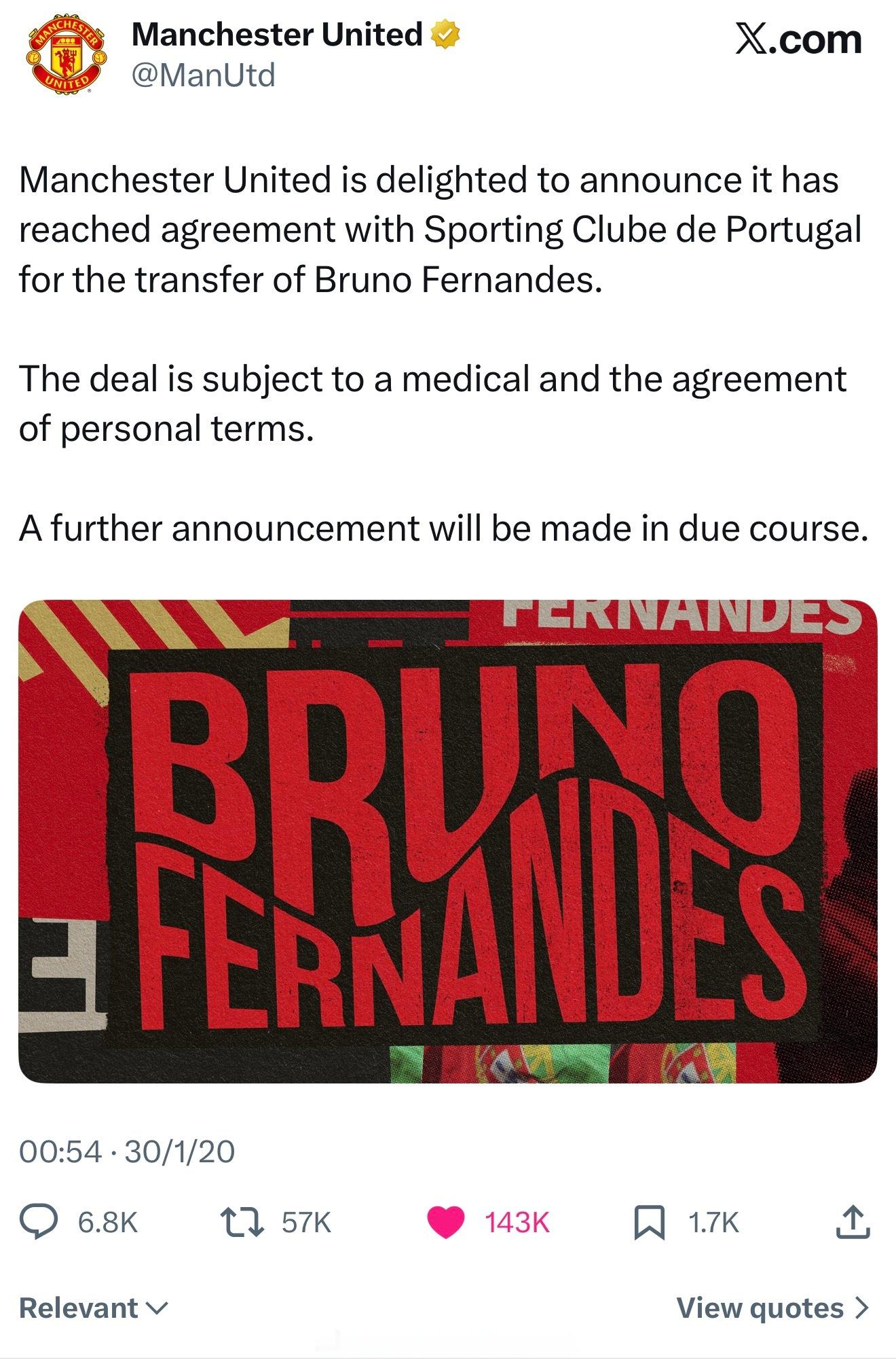 20年1月30日,曼联官宣布鲁诺·费尔南德斯加盟曼联近13年第一签,同意吗?