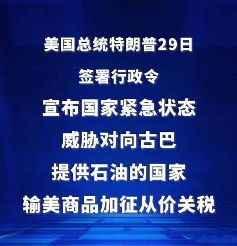 特朗普宣布国家紧急状态1月29日,特朗普签署行政令宣布国家紧急状态,威胁对向古巴提供石油的国家,对其出口美国商品加征关税。