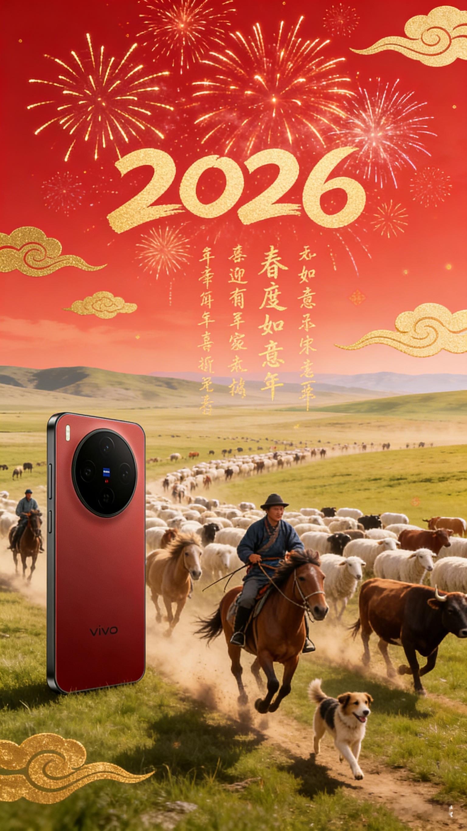 万马奔腾、牧人追逐、牛羊满圈,这才是新年该有的好运!vivo X300带着好运红提前给各位发财、健康的蓝朋友拜个早年!vivo