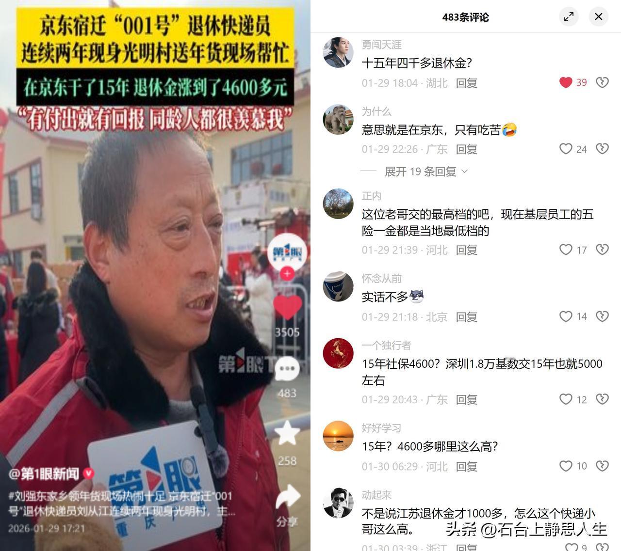 15年工龄,退休金4600 京东宿迁001号退休快递员刘师傅,在京东干了15年,现在每月能拿4600多退休金,回乡帮发年货时,说身边同龄人都羡慕他。这事儿一出,大家满是疑惑,毕竟多数人印象里,15年按最低基数缴社保,退休金也就一两千。 这数字并不玄乎,核心就是实缴俩字。当下不少企业里,按最低基数缴社保是默认操作,大家甚至慢慢习惯了能缴就不错的心态。刘师傅的退休金,不过是企业实打实按他的工资基数缴了15年社保的结果,没什么特殊照顾,只是把本该有的权益落到了实处。 对普通人来说,退休后的底气从来不是画饼。每个月从工资里扣走的那笔社保钱,能不能真真切切算进养老账户,才是实打实的安全感。这事儿看着是个案,却触及了多少人藏在心里的养老焦虑?