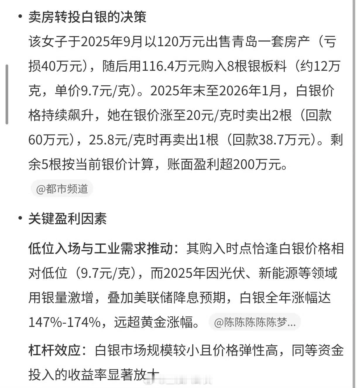 女子卖房买白银5个月狂赚200万山东大姐亏40万卖房凑120万梭哈白银,9块7一克买了12万克,才5个月就狂赚200万,真是厉害