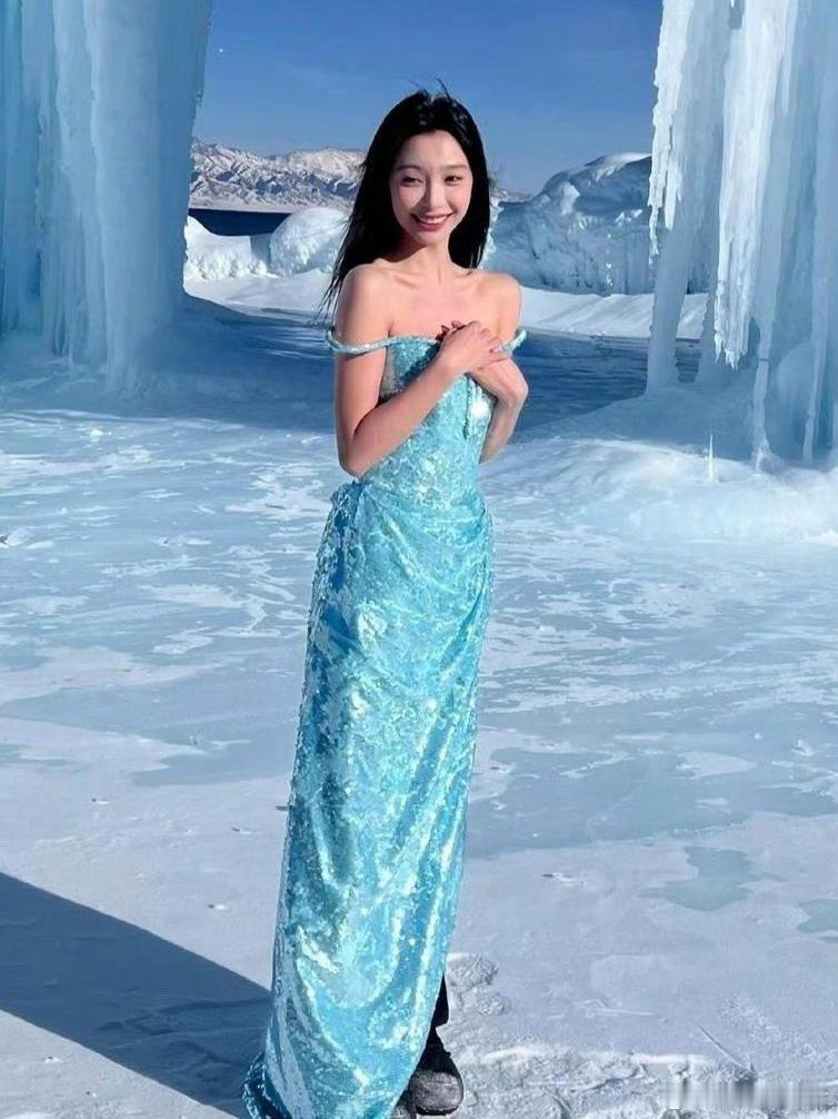 易梦玲在冰川上穿吊带裙拍照易梦玲在新疆赛里木湖冰川区穿吊带高定裙拍照,下身没有穿黑丝而是长裤。把女神冻得瑟瑟发抖的样子楚楚可人。