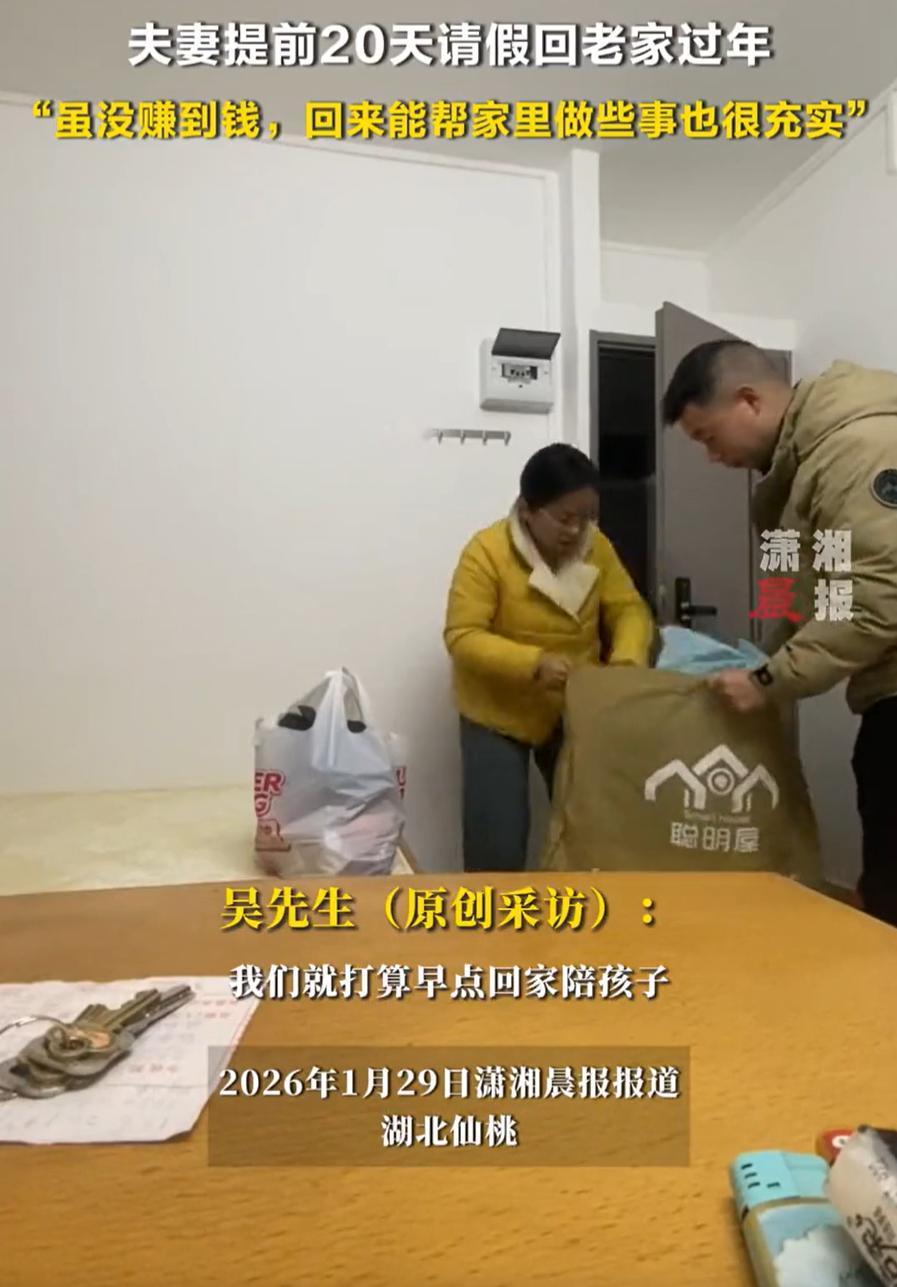 这才是真正的聪明人!湖北仙桃,一对夫妻在广州打工,眼看就要过年了,小两口一商量直接提前天回家过年,虽然一年下来没赚到钱,但能早点回来帮家里做点事,对她们来说也一样很充实 吴先生介绍,夫妻俩是在广州服装厂工作的,忙活了一年。临近年关,两人翻翻账本,没存下太多钱,但心里早有了别的打算,他们没像周围工友那样等着抢春运的票,而是提前二十天就收拾了行李。九号早上从广州出发,十号下午,老家的大门就被推开了 最先冲出来的是孩子,接着是老人。没有隆重的迎接,但每个人眼里都亮着光。夫妻俩放下行李,卷起袖子就进了厨房。帮母亲摘菜,陪父亲说话,听孩子讲学校里的新鲜事。虽然一年多没回来,但家里的一切都还顺手 街坊邻居有些议论,说这么早回来,怕是没挣到钱吧。夫妻俩听了只是笑笑。确实没攒下多少,但时间攒下来了,不用在火车站挤十几个小时,不用为抢票熬夜,也不用赶着初七八就匆匆离家。这些天,能看着孩子写作业,能帮老人把年货备齐,能把屋前屋后收拾利索 有网友说:提前二十天回家,没有春运的拥挤,只有推门时家人眼里的惊喜。日子慢下来,陪爸妈唠嗑做饭,看烟火慢慢升起,原来幸福就是早一点团圆,多一点陪伴 想想确实如此,钱可以慢慢挣,但有些时光错过了就补不回来了。尤其是孩子长得快,一年一个样。老人年纪大了,见一面少一面。趁现在都还健康团圆,多陪一天是一天 或许过年真正的意义,从来不是衣锦还乡的风光,而是推开门时那声“回来了”的踏实。是一家人围坐在一起的温热,是能伸手帮上忙的实在 他们计划用这些天,把家里需要修补的地方都弄弄,陪老人去镇上置办年货,给孩子辅导一下功课。这些琐碎平常的事,在外打工时常常惦记,如今亲手做起来,反而有种充实的幸福感