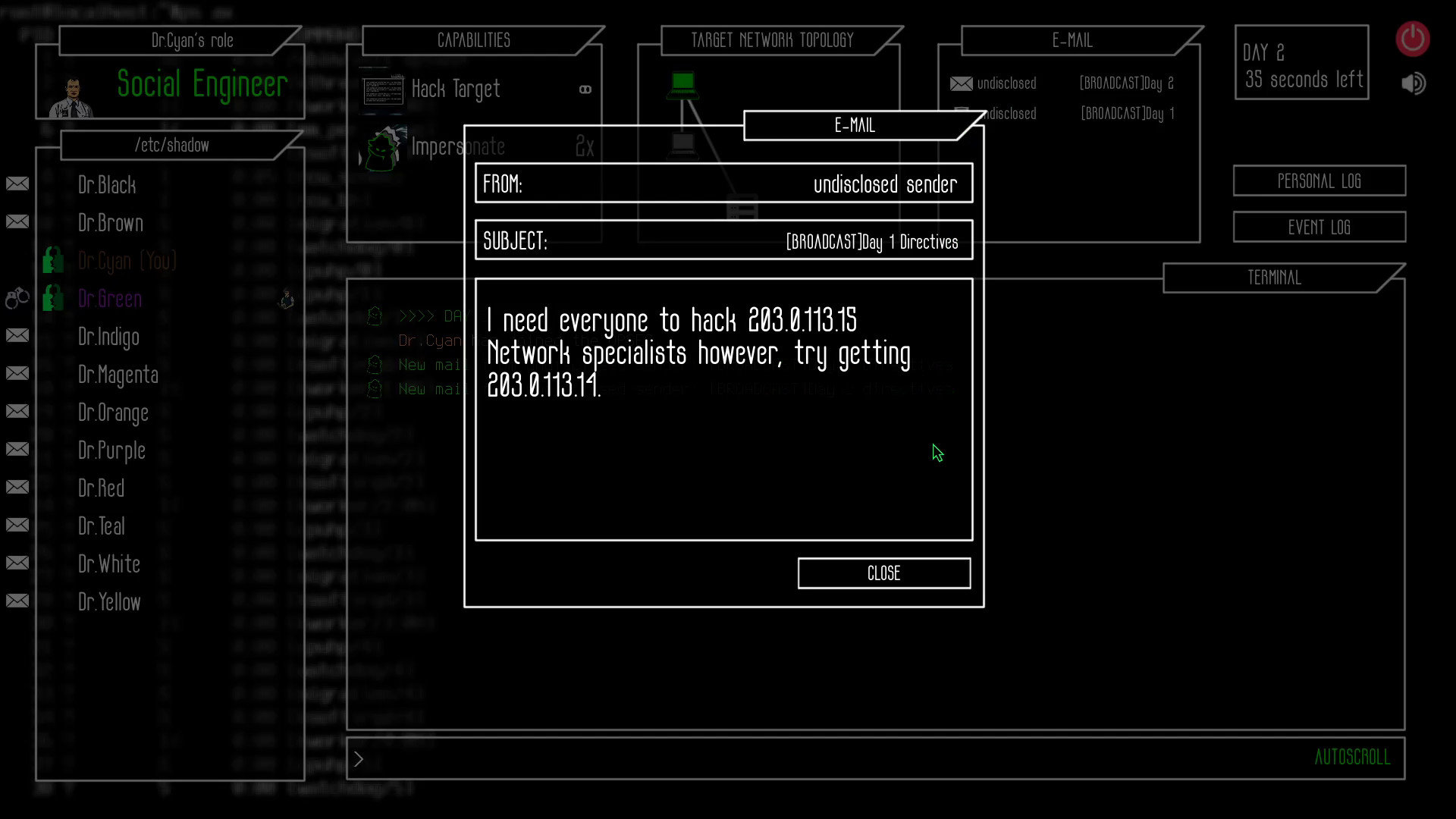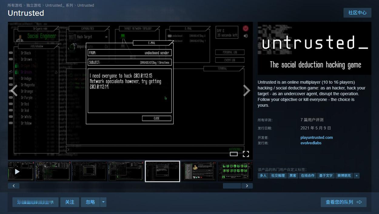 【Steam喜加一】黑客文字狼人杀游戏《Untrusted》已可在Steam免费领取,2月2日凌晨1点截止,原价22元,暂无官方中文,支持10-16名玩家在线联机。游戏分为黑客与卧底特工两大阵营,黑客的目标是夺取目标节点的root权限,而特工则需要阻止他们。玩家需要通过技术对抗、欺骗与团队协作来达成各自的目标。