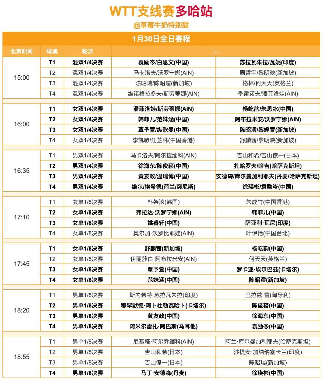 WTT多哈支线赛1月30日赛程 黄友政VS徐海东 过早的内战 1月29日多哈支线赛的比赛中, 温瑞博首轮出局, 输给了不知名的对手尼基塔, 着实让人没有想到! 黄友政/纵歌曼,陈俊菘/覃予宣 两组混双首轮出局, 也是让我们对小将们的混双 有了新的认识,还需要磨练! 1月30日, 重点赛程,袁励岑/白思文 的混双,国乒就剩最后一组啦, 加油! 徐海东/陈俊菘,黄友政/温瑞博的 男双值得我们期待, 黄友政VS徐海东在今天晚上 18:20开战,值得期待! 关注多哈支线赛, 给小将加油!