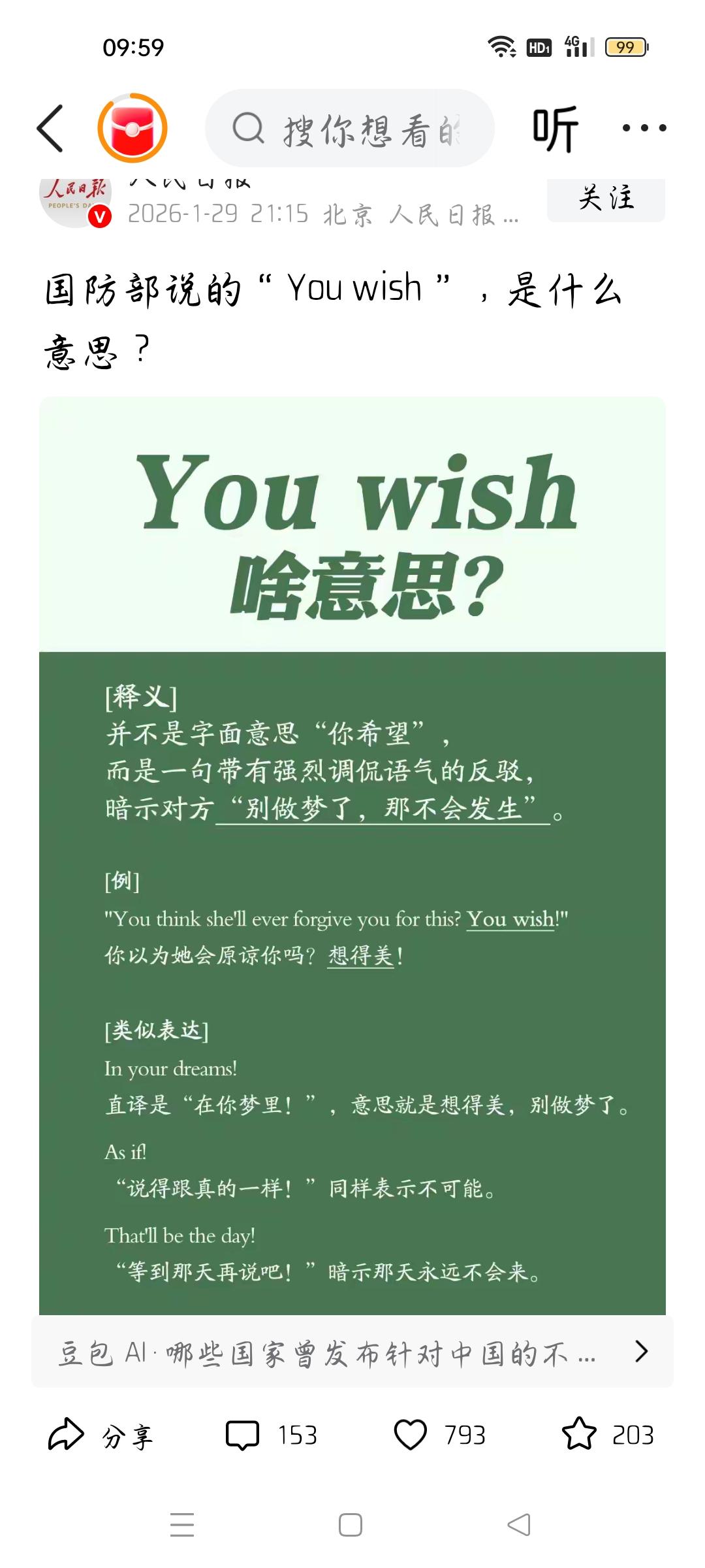 国防部说的”Youwish”啥意思? 据人民日报报道,国防部回应多国发布"击沉"中国舰艇视频,蒋斌大校调侃称"Youwish",这是什么意思呢?"别做梦了,那不会发生"。多国诋毁中国,颠倒黑白,可惜白就白,黑就是黑。唉!这些军工企业想把中国描黑,没想到中国还是一个大国,肯定会回击,事实胜于雄辩,蒋斌大校的调侃显示中国的大度和担当。让那些制作视频的始作俑者无地自容。我说得对吗?欢迎评论。