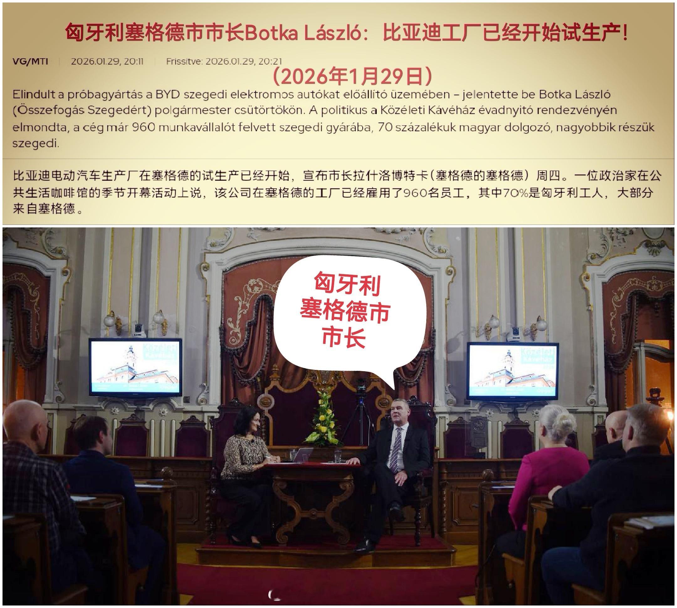 试产!比亚迪欧洲首座乘用车工厂!1月29日,匈牙利塞格德市市长Botka László表示:BYD Szeged(塞格德)工厂已经开始试生产,将于春季正式投产(3-4月份)!