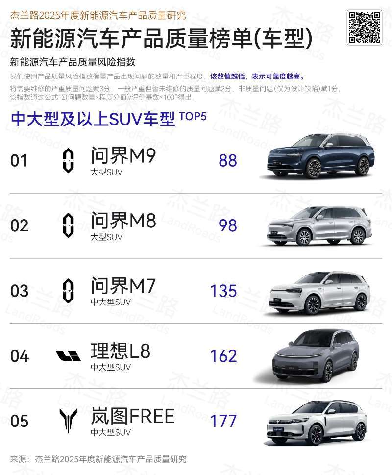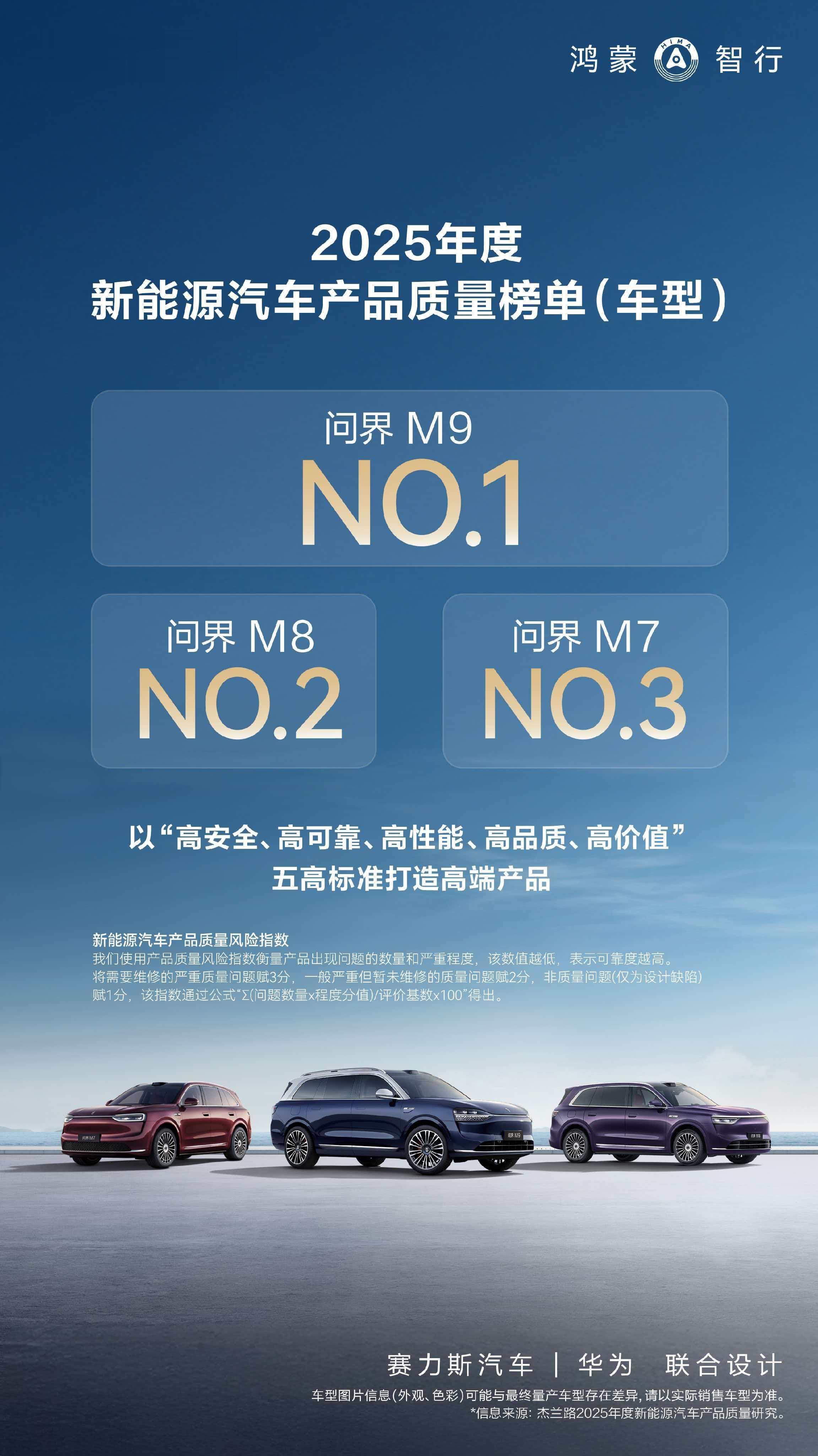 问界斩获杰兰路2025年度新能源汽车产品质量品牌榜第一,问界M9问界M8问界M7 霸榜中大型及以上车型质量榜前三。所以知道问界问啥能持续卖得好了吧?