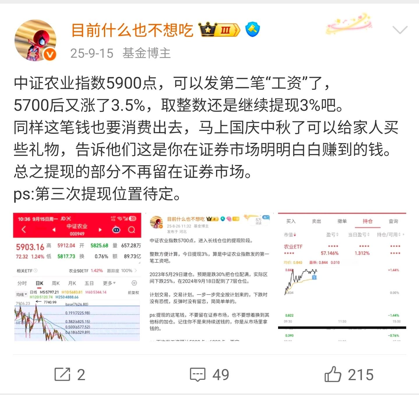 中证农业指数,6100点第三笔继续提现3%,上次提现是中秋,这次临近春节了。养殖、种植、辅助生产材料,分别对应了畜牧、粮食、化工。畜牧是大权重,粮食和化工是小权重。所以即使粮食和化工涨的都挺好,无奈还是猪猪拖了后腿。下次提现待定。