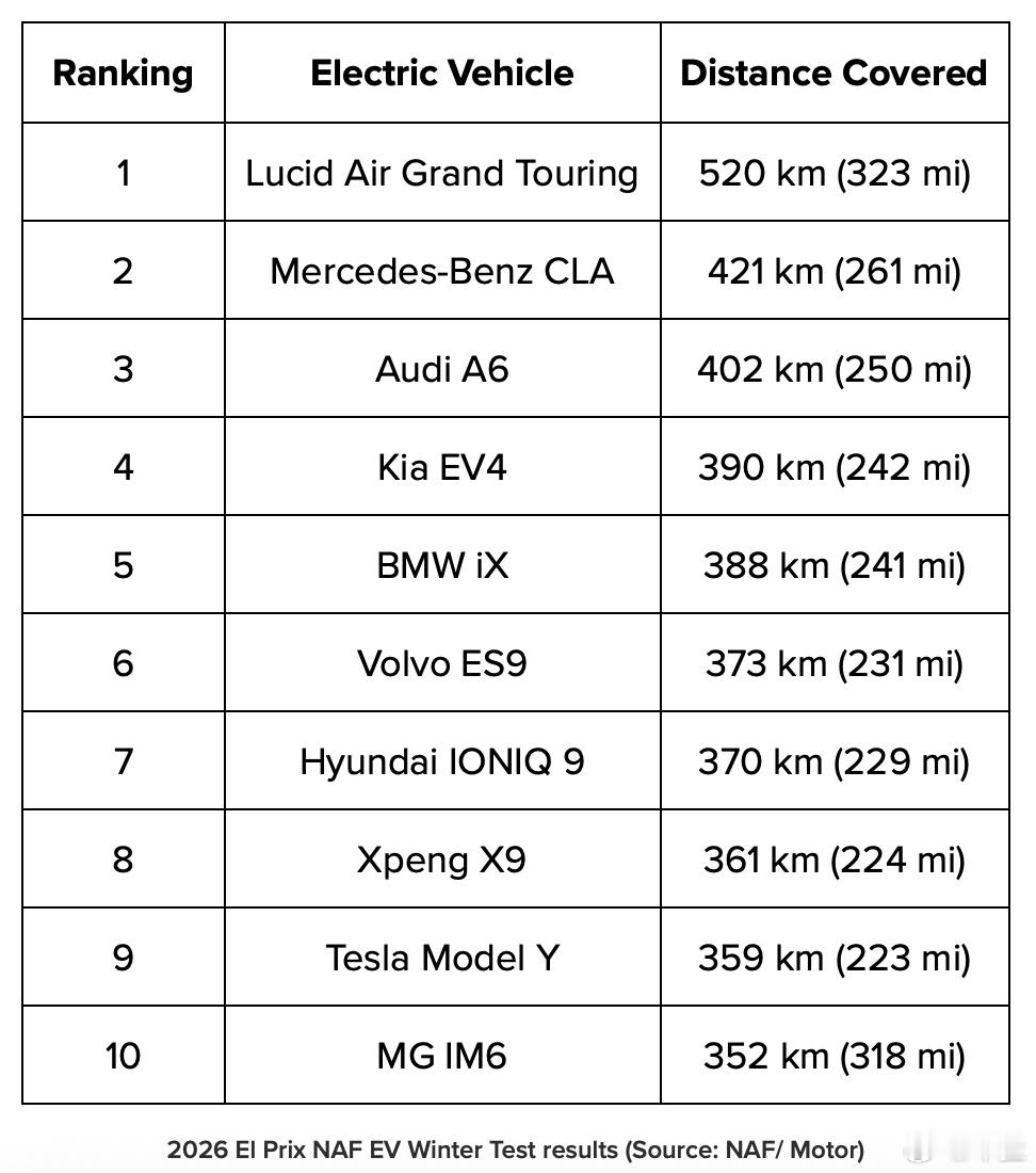 挪威电动车续航测试,Lucid Air又拿了第一挪威汽车联合会(NAF)和《Motor》杂志举办的2026续航测试,找了24辆纯电动车,从奥斯陆充满电出发,气温低至-31°C。最终跑的距离最远的Lucid Air Grand Touring,行驶了519公里后剩余电量1%,这也是Lucid再次夺冠,去年7月这款车曾创造了电动车续航吉尼斯纪录,单次充电跑了1205公里。这次挪威冬测排名第二的是奔驰CLA,跑了421公里,奥迪A6纯电跑了402公里。不过看了前十名榜单,续航表现和这些纯电动车的销量及受欢迎程度似乎并不成正比,最畅销的特斯拉Model Y只排名第九。