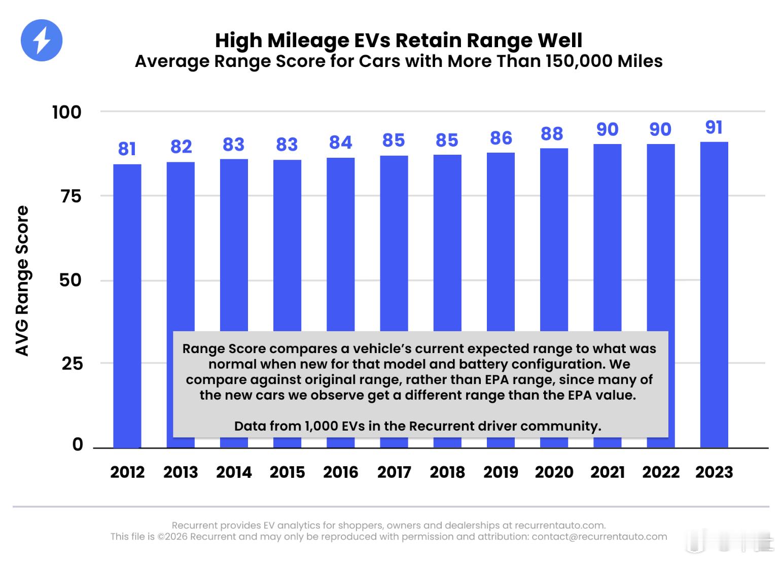 电车车主别焦虑,电池衰减没有想象中可怕纯电动车的电池衰减,和续航焦虑一样,是车主们普遍担忧的点,那些始终不愿意放弃油车的用户们坚信,电车电池用不了几年续航就打折了,和手机电池一样。Recurrent的调查报告给车主们吃了颗定心丸,如今的电池没有那么脆弱。他们调查了1000台行驶里程超过15万英里的纯电动车,结果显示过去十年,电池技术取得很大进步,2023年的电车衰减比2012年的少了10%,也就是说这一代的电车电池还是和可靠的。在Recurrent的调查里,最老的车2012年生产,最新的2023年制造,结果显示2023年产的车能达到91%,即便是2012年产的电车,续航也能维持在81%。而且2022年之后的电车,只有0.3%的遇到过需要更换电池的极端情况,而2017-2021年的第二代电车这个比例还是2%,再往前的第一代电车,比如日产聆风和大众e高尔夫,换电池的比例为8.5%。所以现在买纯电动车的车主,可以放宽心,你们的车至少开个15年没啥大问题。