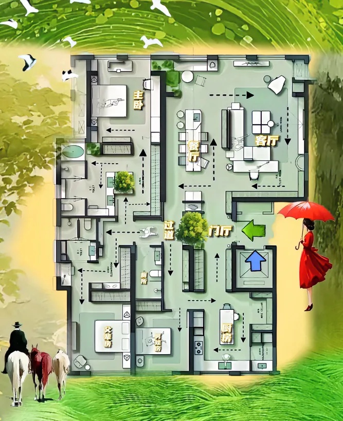 其实就是五口人,三条安静线和一条动线组成的,生活轨迹,从门口到卧室属于休息区,从门厅到厨房,开始煮鱼的一个过程!