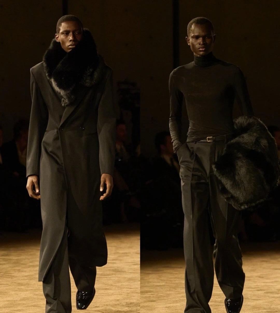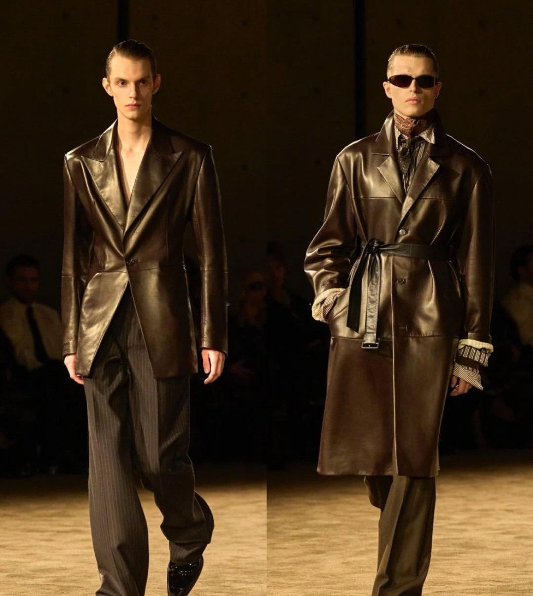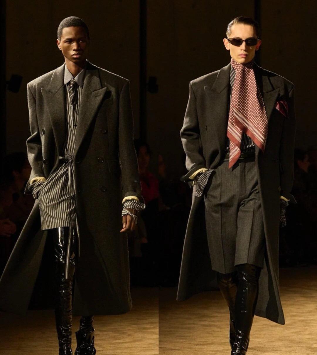 Saint Laurent 2026秋冬男装系列于巴黎证交所黑暗圆厅中发布。创意总监Anthony Vaccarello一改往日明亮色调,以深邃暗色承载本季思考:“不想假装世界一切都好”。系列聚焦剪裁的张力,标志性宽肩与全新收腰设计并存,刚毅之中注入阴柔。丝滑绸缎、闪烁漆皮与柔软薄纱在黑色调中交织出层次光影,紧身针织、飘逸丝巾与奇趣睡衣碰撞出矛盾戏剧感。灵感源自《Giovanni’s Room》中关于身份与自我的拉扯。Vaccarello借此探讨隐藏自我下的孤独与脆弱,以服装打破传统男子气概的边界。漆皮连裤靴性感挑衅,整体造型在亲密与感性中,展露无可替代的极致魅力。巴黎高定时装周巴黎时装周
