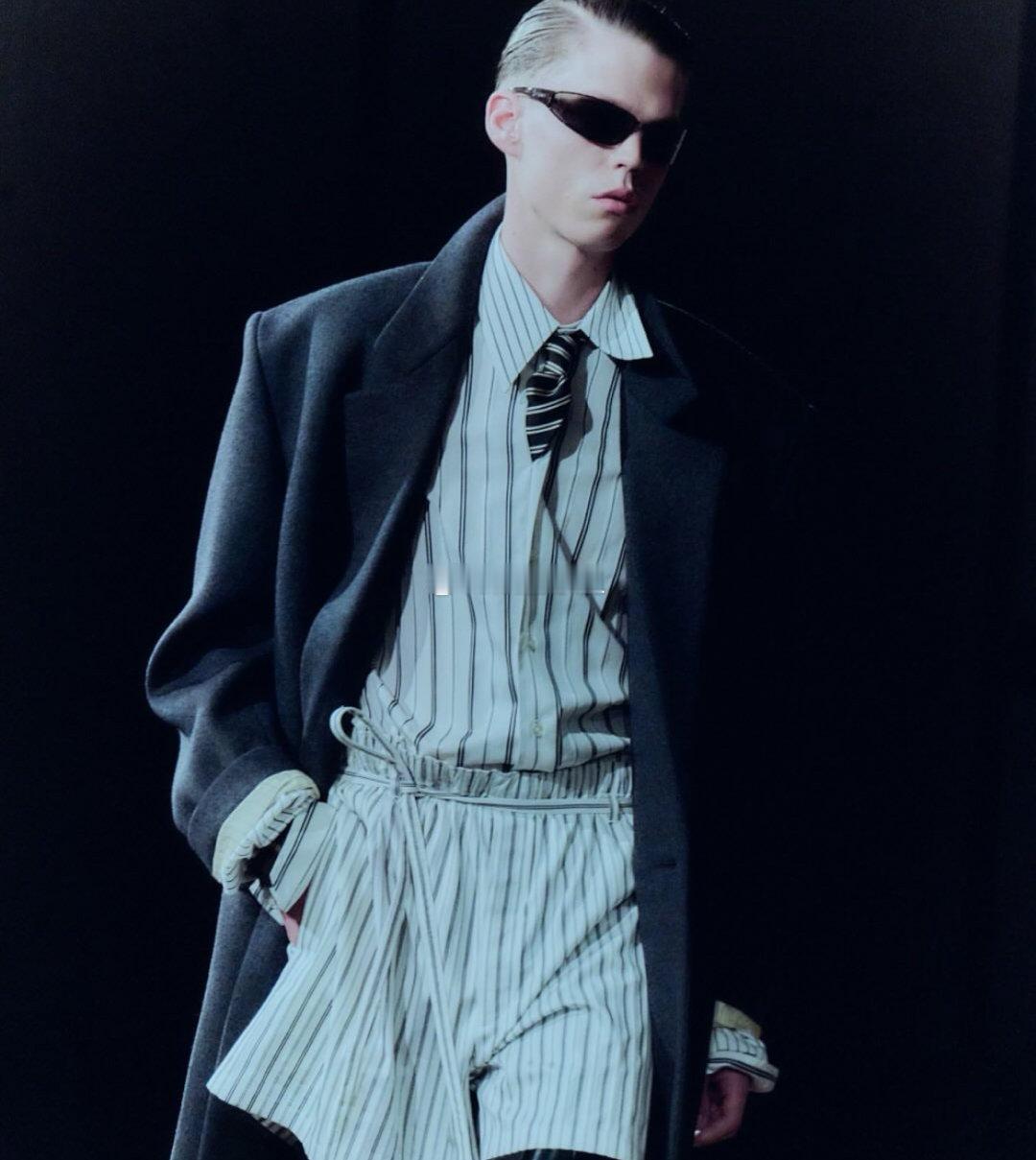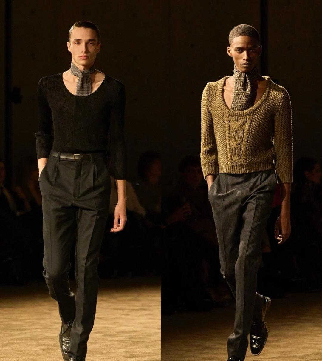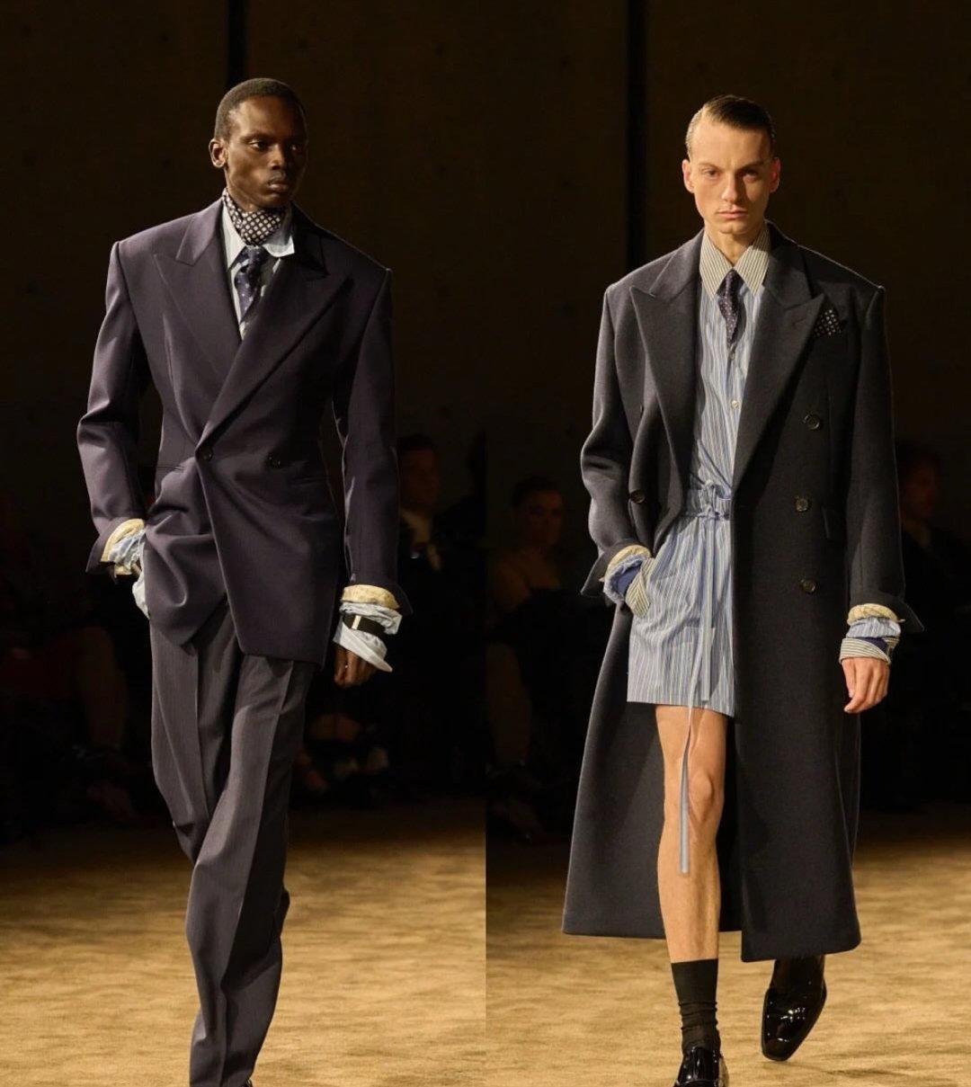 Saint Laurent 2026秋冬男装系列于巴黎证交所黑暗圆厅中发布。创意总监Anthony Vaccarello一改往日明亮色调,以深邃暗色承载本季思考:“不想假装世界一切都好”。系列聚焦剪裁的张力,标志性宽肩与全新收腰设计并存,刚毅之中注入阴柔。丝滑绸缎、闪烁漆皮与柔软薄纱在黑色调中交织出层次光影,紧身针织、飘逸丝巾与奇趣睡衣碰撞出矛盾戏剧感。灵感源自《Giovanni’s Room》中关于身份与自我的拉扯。Vaccarello借此探讨隐藏自我下的孤独与脆弱,以服装打破传统男子气概的边界。漆皮连裤靴性感挑衅,整体造型在亲密与感性中,展露无可替代的极致魅力。巴黎高定时装周巴黎时装周